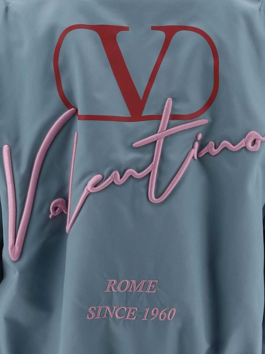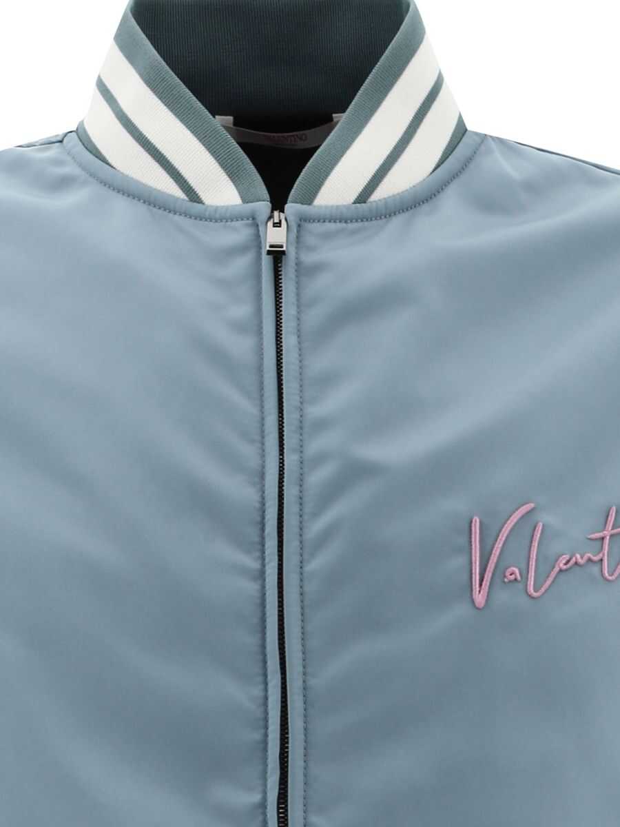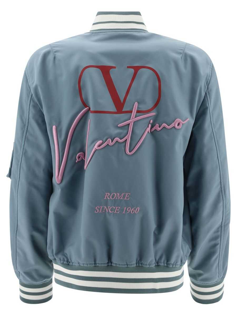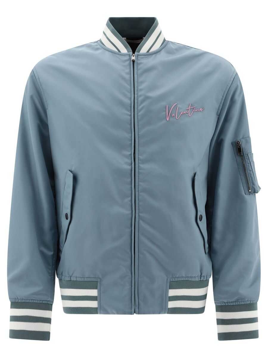 Light blue casual jacket from Valentino featuring long sleeves, zip fastening, ribbed cuffs and hem, back embroidered and pockets.