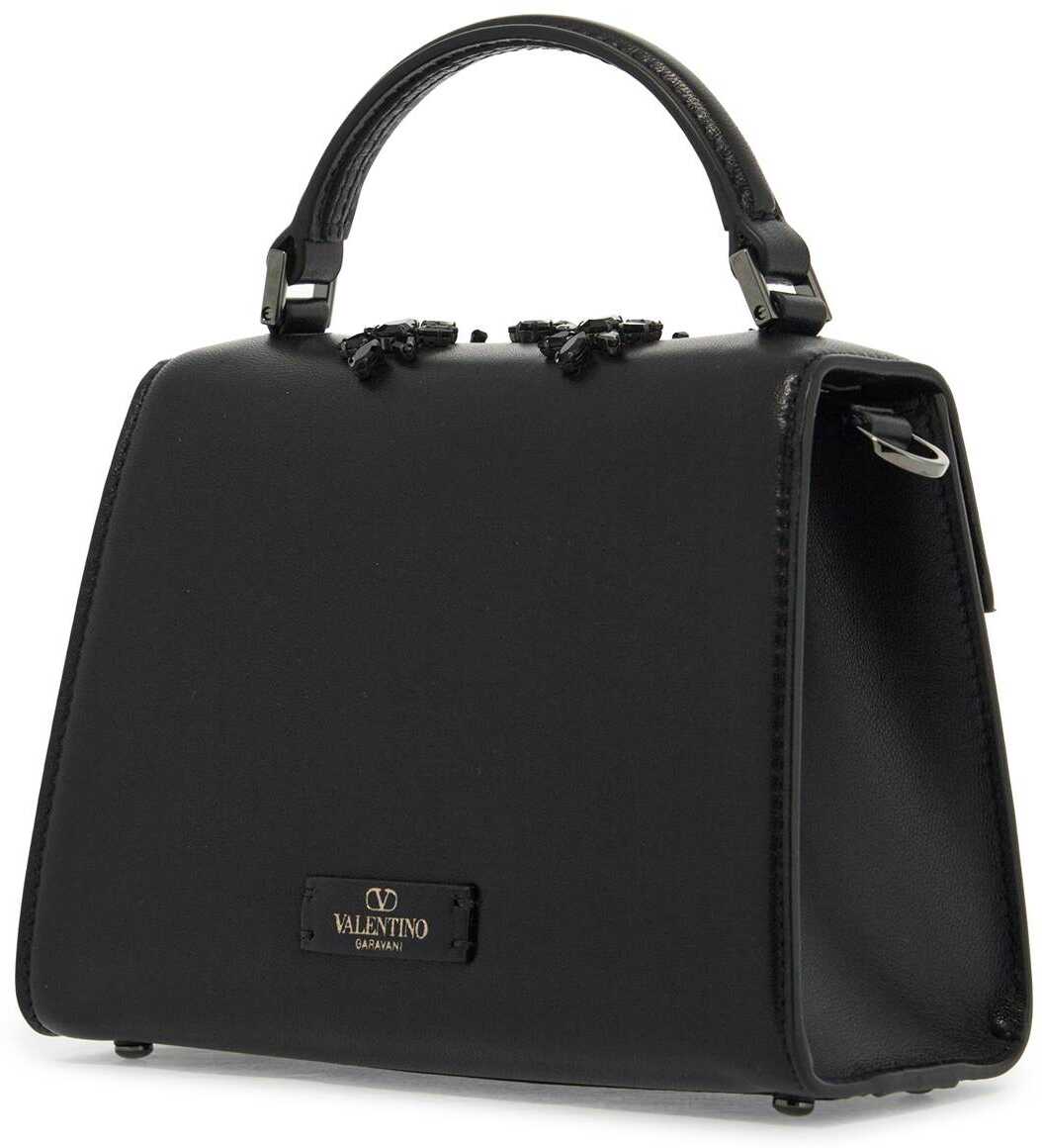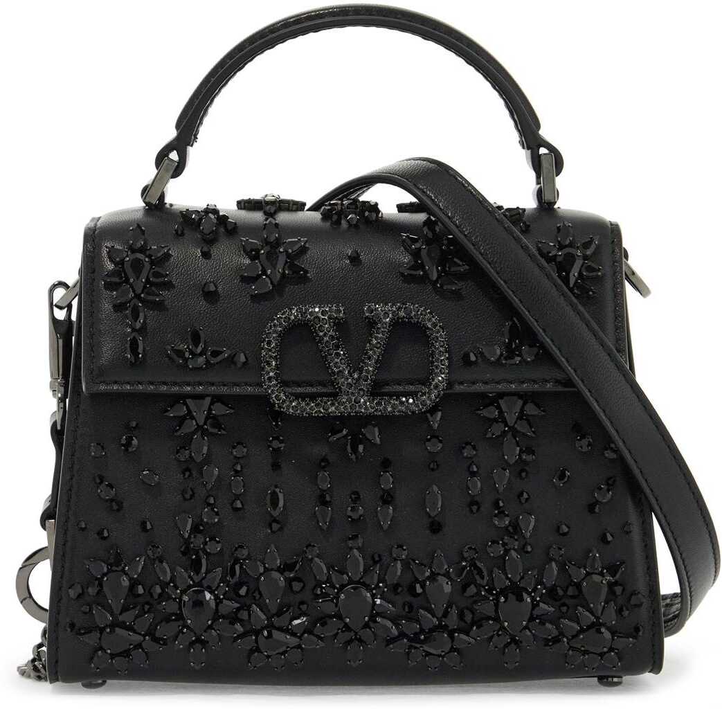 The mini VSLING handbag by Valentino Garavani is made of soft leather and embellished with sparkling rhinestones on the front. The magnetic clip closure features a Swarovski®-covered VLogo Signature. It has a single handle, a suede-lined interior with an open pocket, and a removable shoulder strap adorned with a chain and ring clasp for a versatile crossbody or shoulder look. The base is equipped with protective feet and all metallic accessories have a ruthen