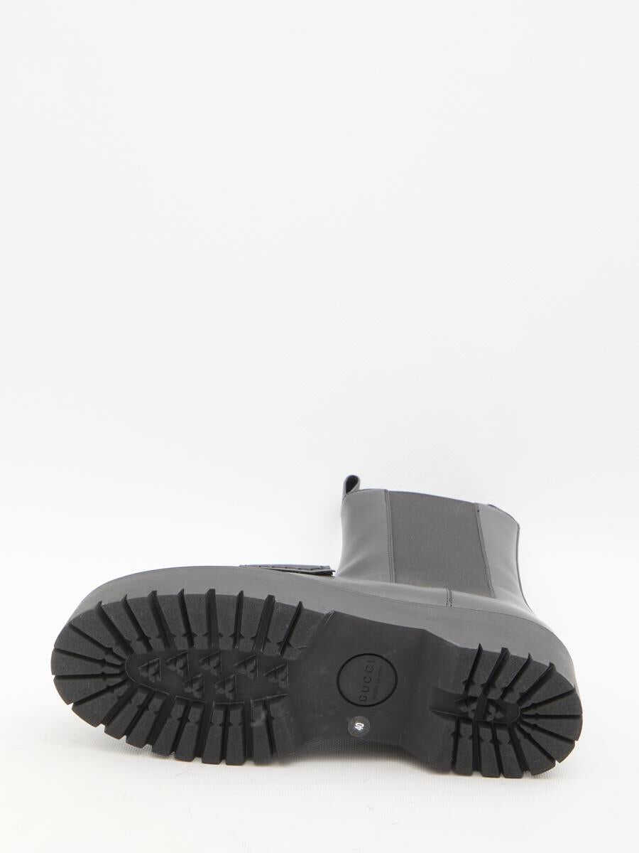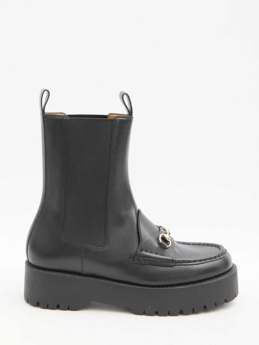 Black leather boots with light gold-tone metal Horsebit. They feature loafer-shaped front, side elasticated inserts, front and rear loop tab and lug rubber sole. Dust bag included. Any leather imperfections are not to be considered manufacturing defects, but a peculiarity of the material.
