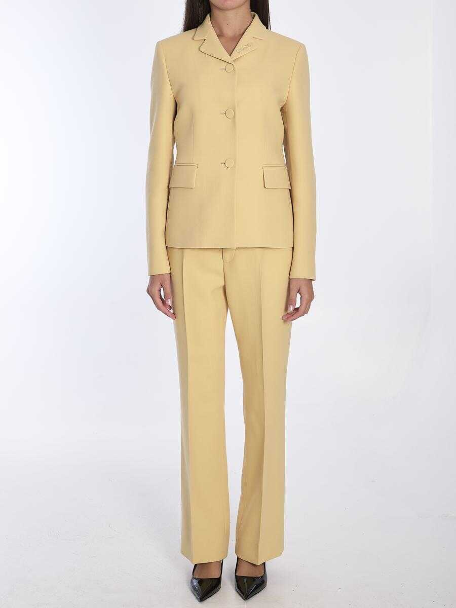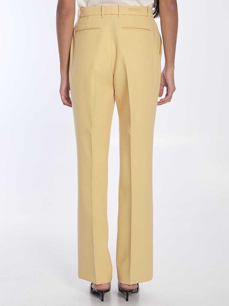 Yellow fine wool crêpe trousers with pleats and Gucci embroidery at rear waist. It features zip, button and hook-and-eye closure, two side welt pockets, two rear welt pockets and belt loops. Boot cut. Regular fit.