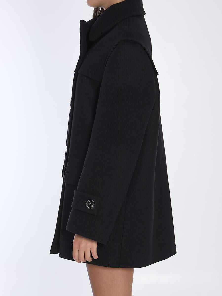 Black Batavia wool coat with round Interlocking G buttons. It features pointed lapels, double-breasted closure, two front flap pockets, belted cuffs and back vent with Web detail. Quilted lining. Relaxed fit.