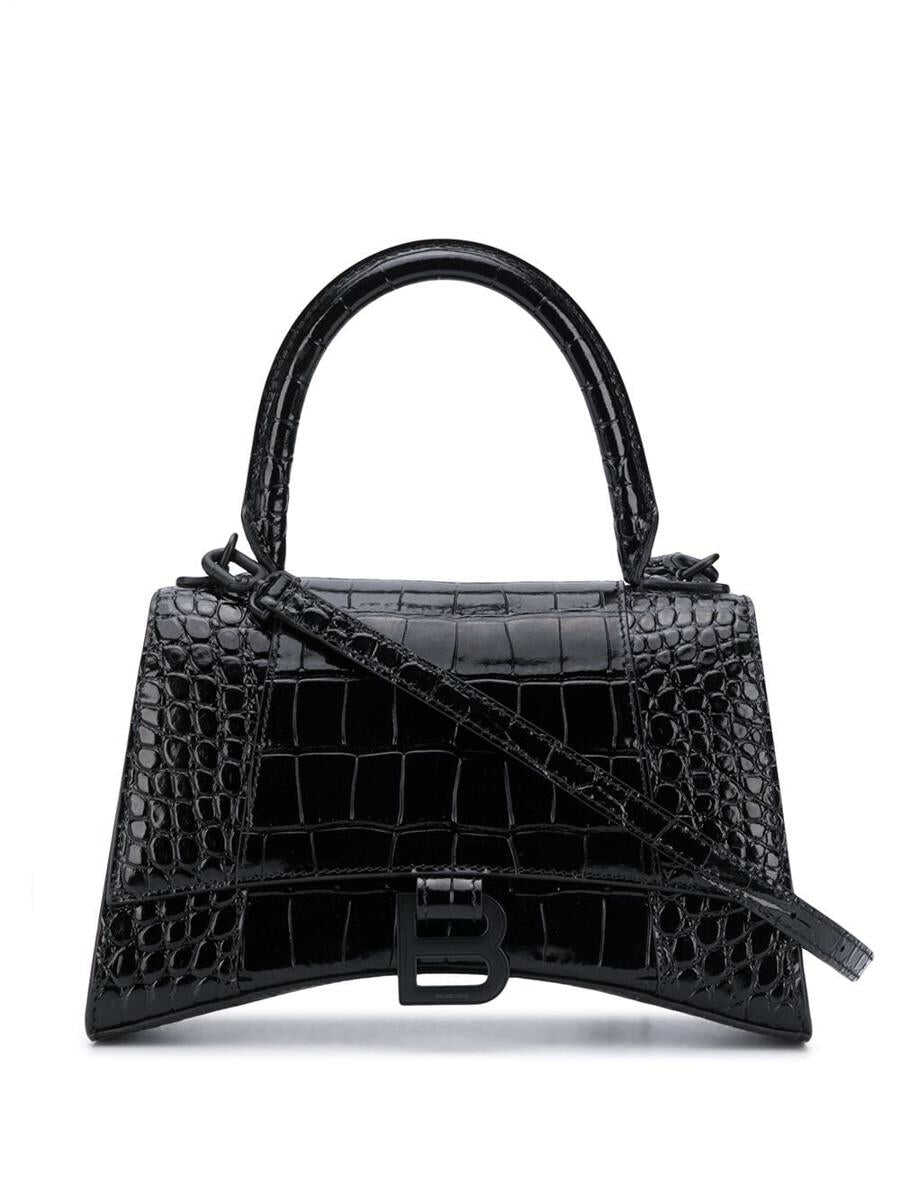 Black leather S Hourglass top handle tote from BALENCIAGA featuring single rounded top handle, adjustable detachable shoulder strap, embossed crocodile effect, foldover top with magnetic fastening, internal logo stamp, main compartment, internal zip pocket, B logo to the front and back slip pocket.