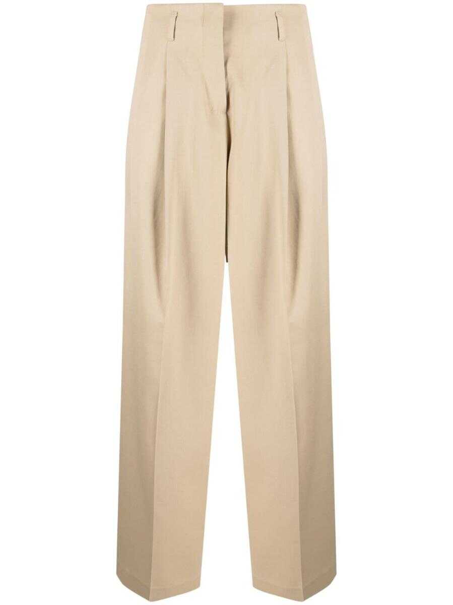sand beige logo patch to the rear star stud detailing pressed crease high waist box-pleat detail two rear flap pockets belt loops wide leg