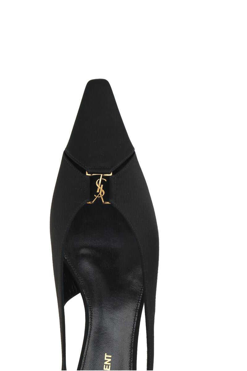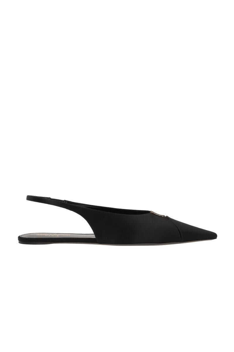 Saint Laurent's flat slingbacks crafted in black crêpe satin with the iconic metal Cassandre logo and cut-out details. Featuring an elongated square-toe, elasticated ankle strap, leather lining and leather sole.