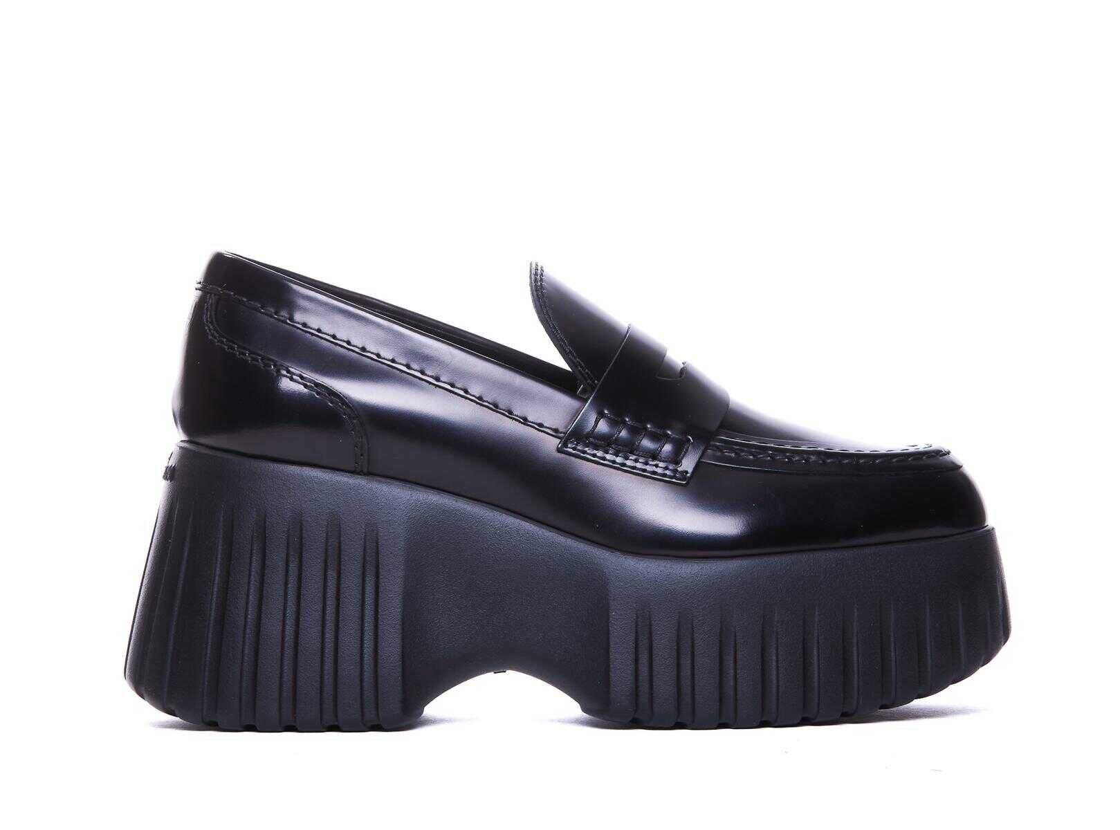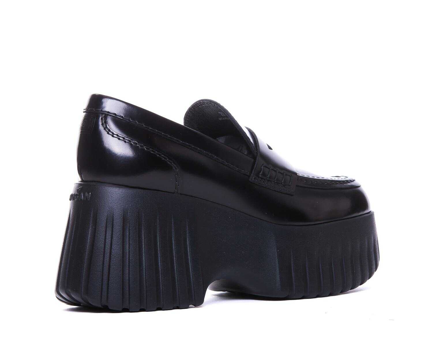 Hogan black H-Stripes loafers, round toe, patent leather upper, platform model, Heel 8 cm, plateau 5 cm.