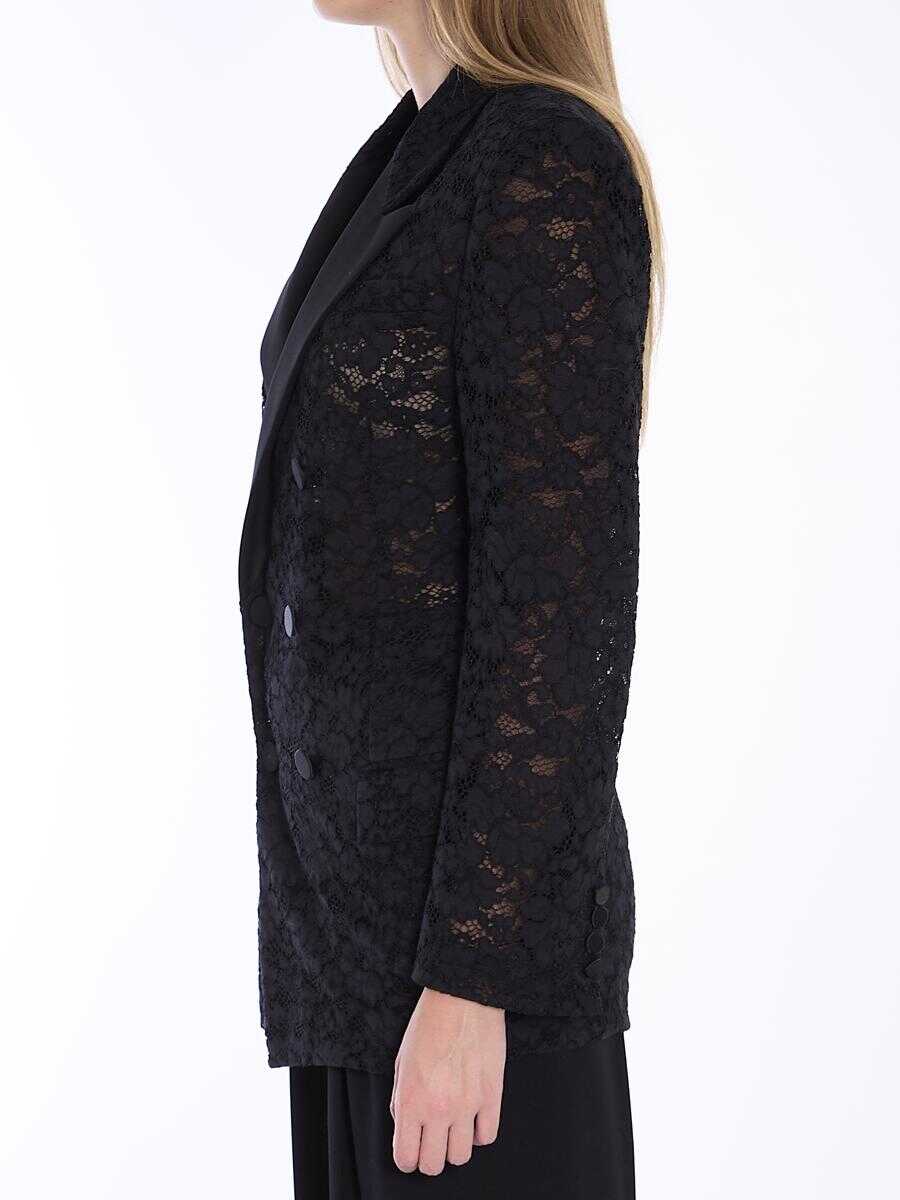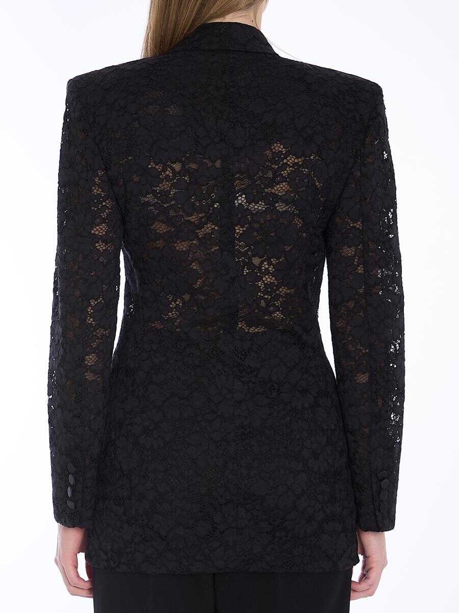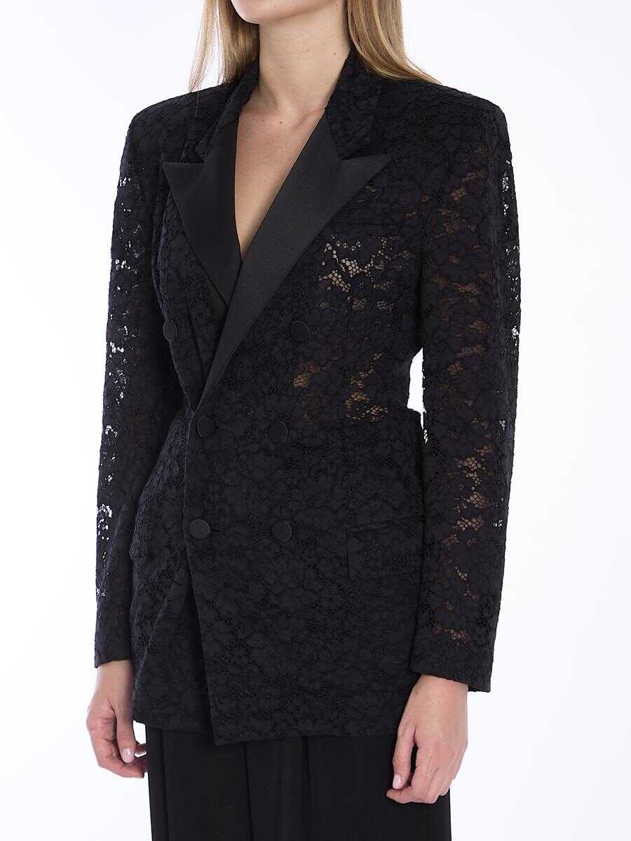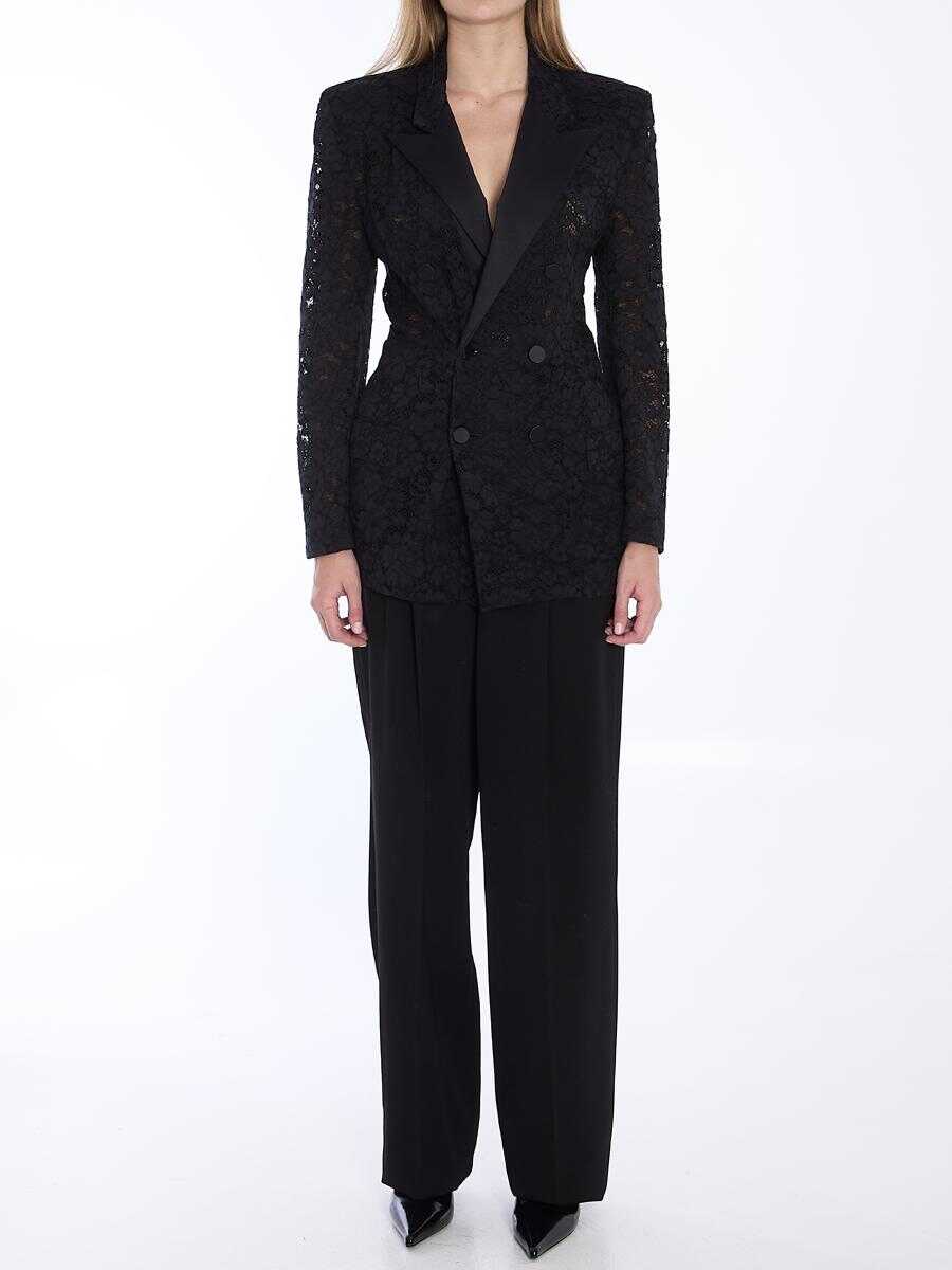 Semi-sheer tuxedo jacket in black guipure. It features padded shoulders, satin peaked lapels, double-breasted button closure, a welt pocket on chest, two front flap pockets and buttoned cuffs. Fitted style.