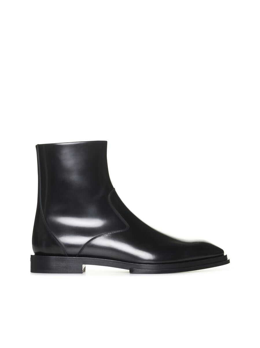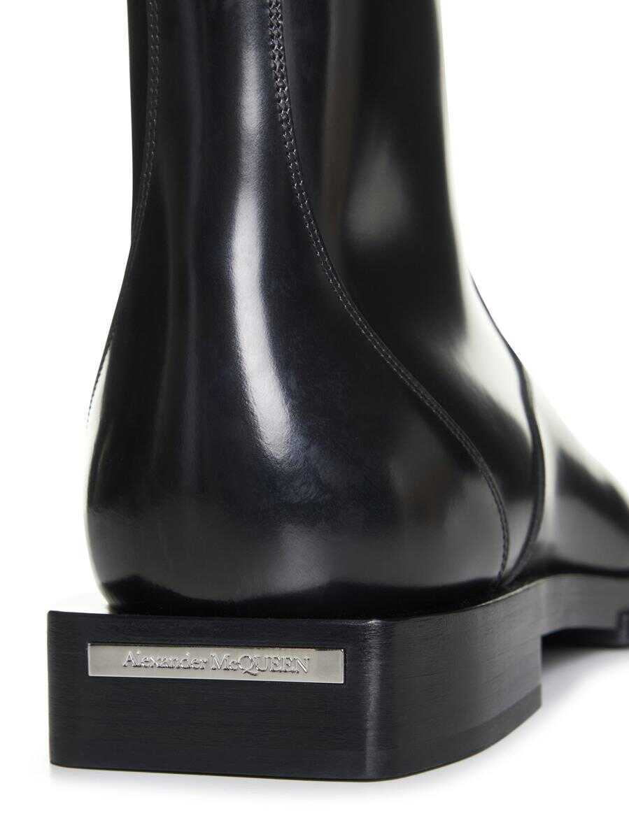 Alexander McQueen’s black brushed leather ankle boots featuring a tapered toe, side zip fastening and leather sole with low square heel and silver-tone metal lettering logo plaque.