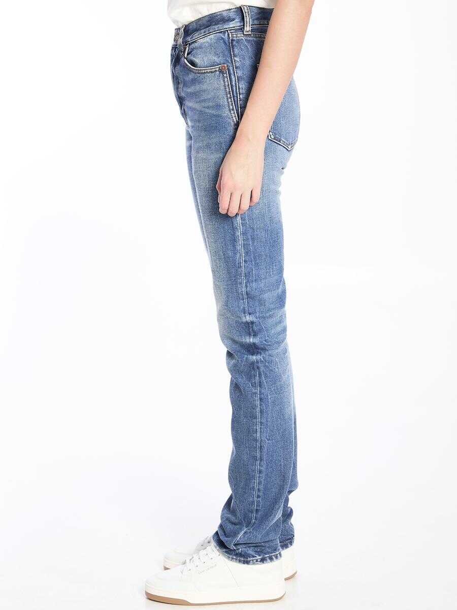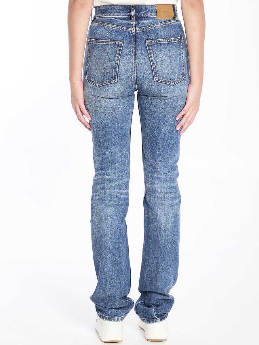90s style high-waisted straight long leg jeans in 50s blue denim. It features button closure, five-pocket design, belt loops and rear patch. Slim fit.