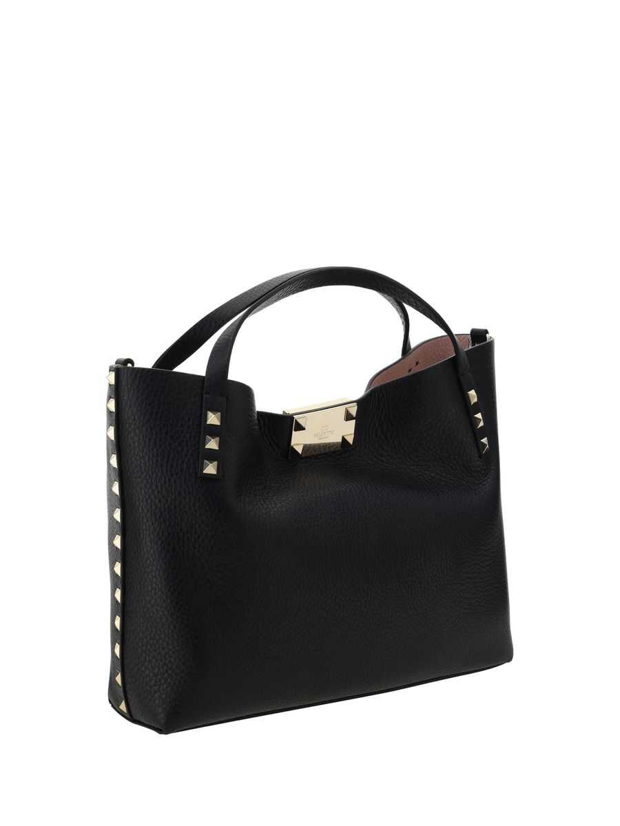 Gold-colored Rockstud details, engraved logo, hook closure, flat handles, single compartment, internal zip pocket and removable shoulder strap. Material: calf leather.