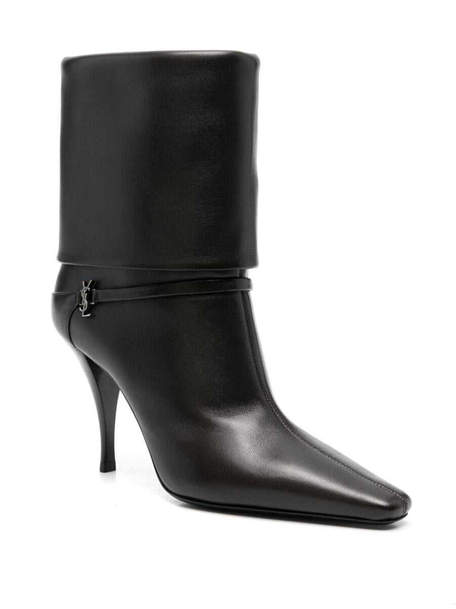 coffee brown calf leather smooth grain folded design slip-on style 85mm high stiletto heel strap detailing appliqué logo square toe branded leather insole leather sole ankle-length