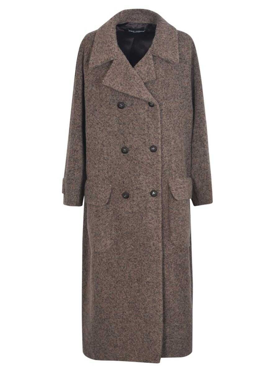 notched-lapels button-down coat from DOLCE & GABBANA featuring brown, alpaca wool-blend, notched lapels, double-breasted button fastening, two side flap pockets, long sleeves, straight hem and mid-calf length.