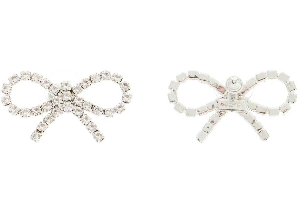 Self Portrait earrings with an iconic bow shape, made of a brass mesh in silver finish and embellished with crystals. Pin closure for pierced lobes.