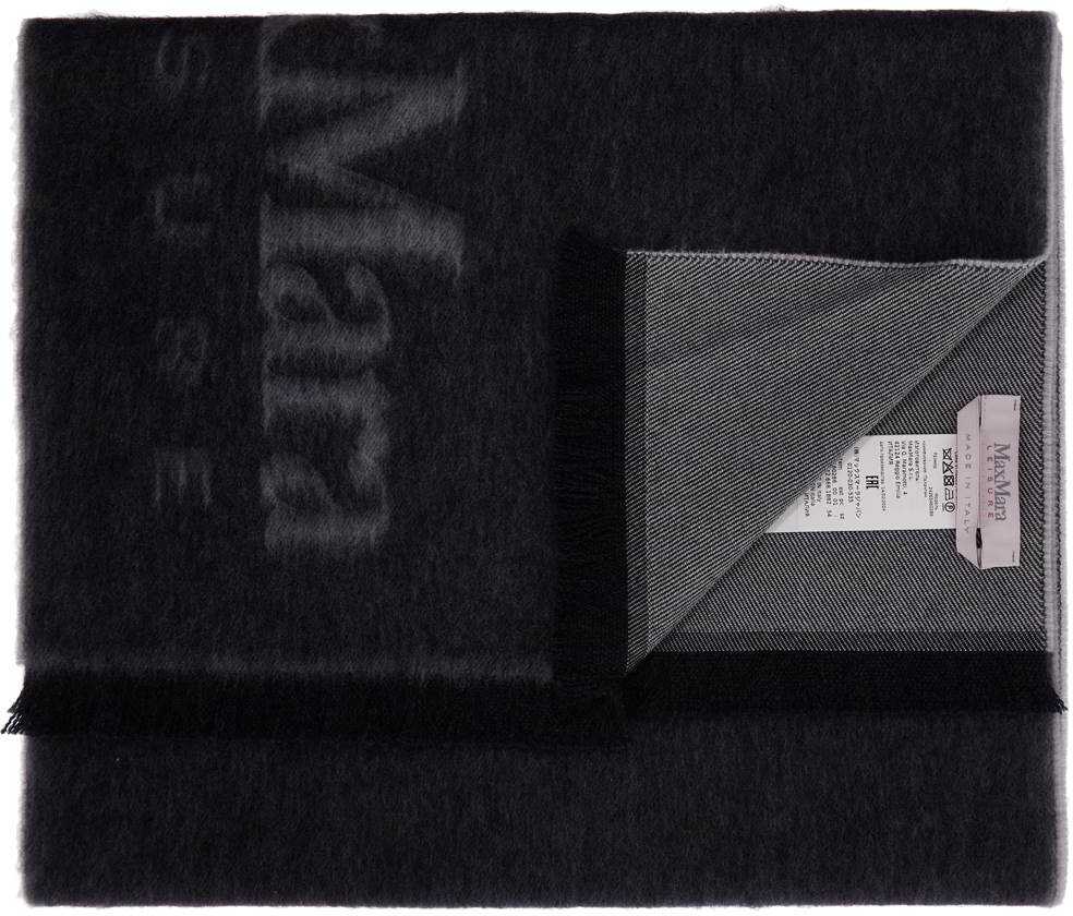 Max Mara Leisure scarf made of pure wool jacquard with lettering logo and contrasting bands on the bottom and fringed edges.