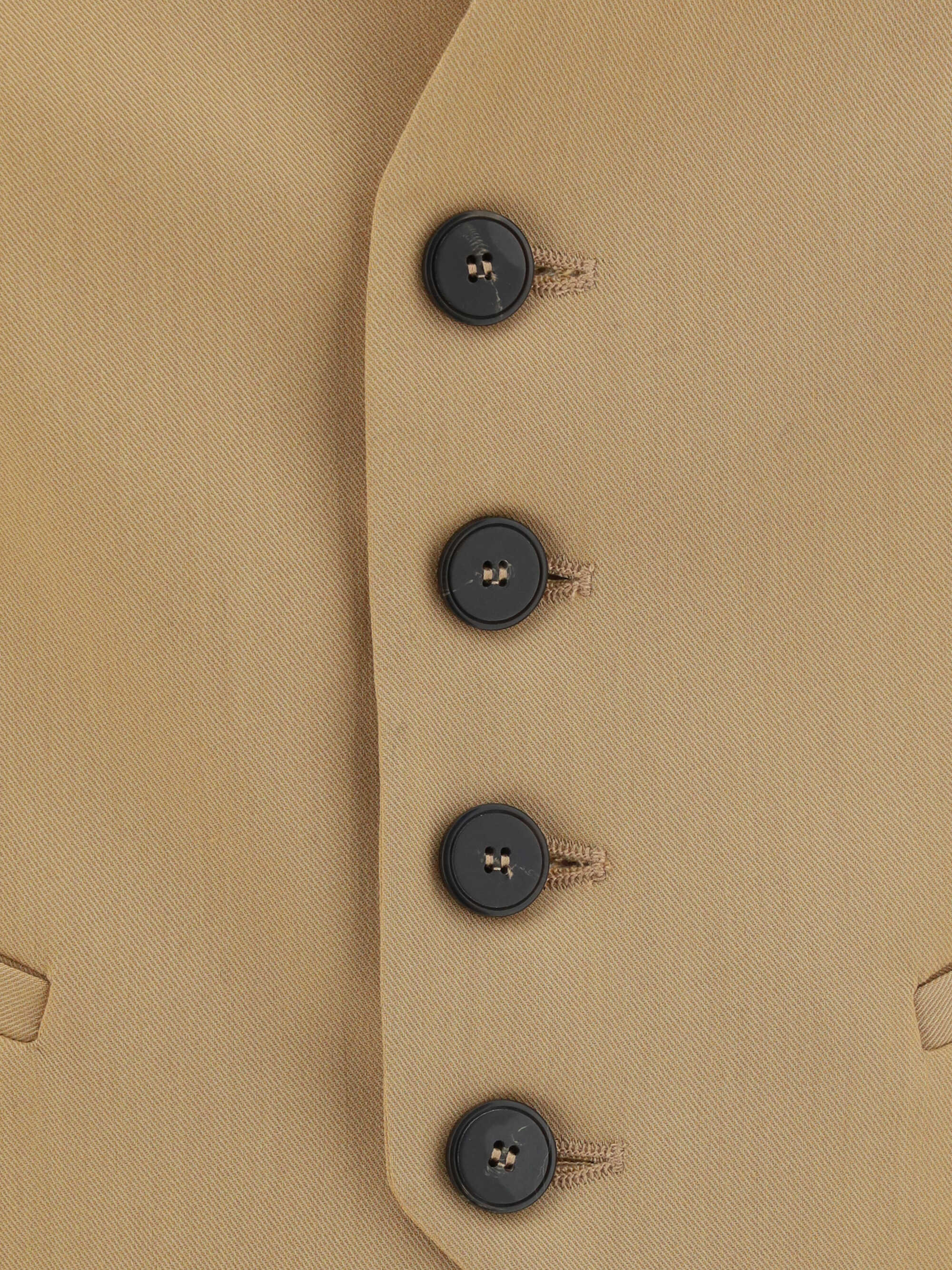 Vest by Forte_Forte, V-neck front, button front closure, adjustable martingale pattern strap on back panel, two mock flap pockets on front, paneled design, monochrome pattern, regular fit.