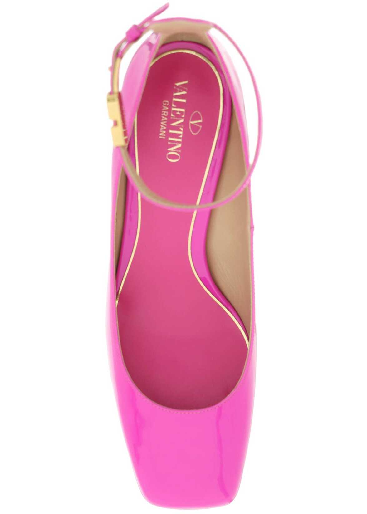Patent leather Tan-Go pumps by Valentino Garvani with an adjustable ankle strap with gold metal VLogo Signature buckle. Square toe, leather footbed and leather sole.