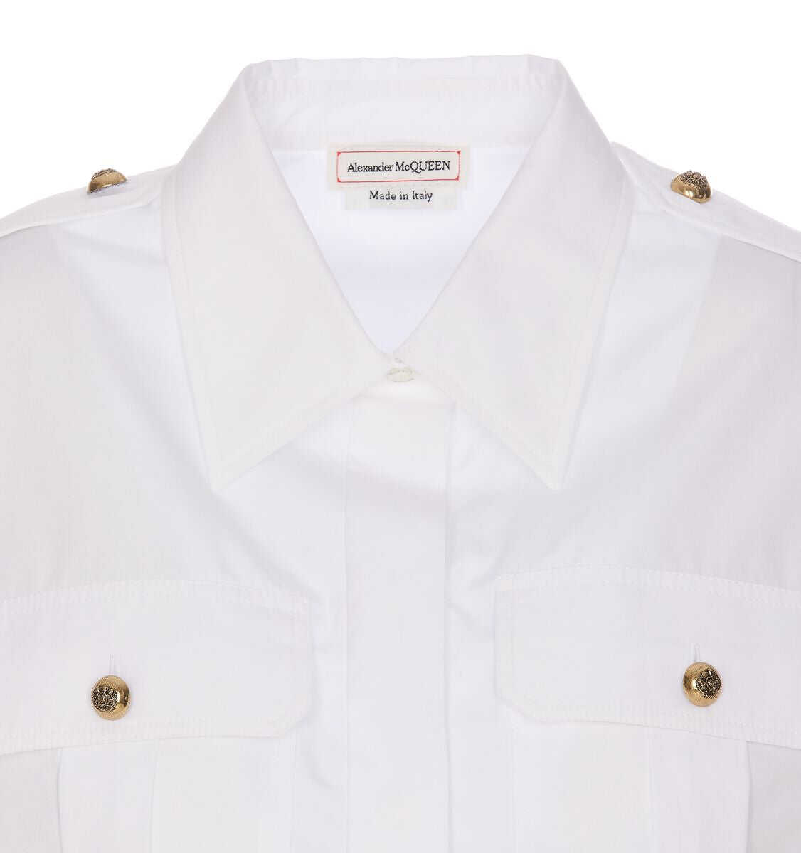 box-pleat cotton shirt from Alexander McQueen featuring white, cotton, box-pleat detail, embossed gold-tone buttons, classic collar, concealed front fastening, epaulettes, long sleeves and two chest flap pockets. This piece fits true to size. We recommend you get your regular size