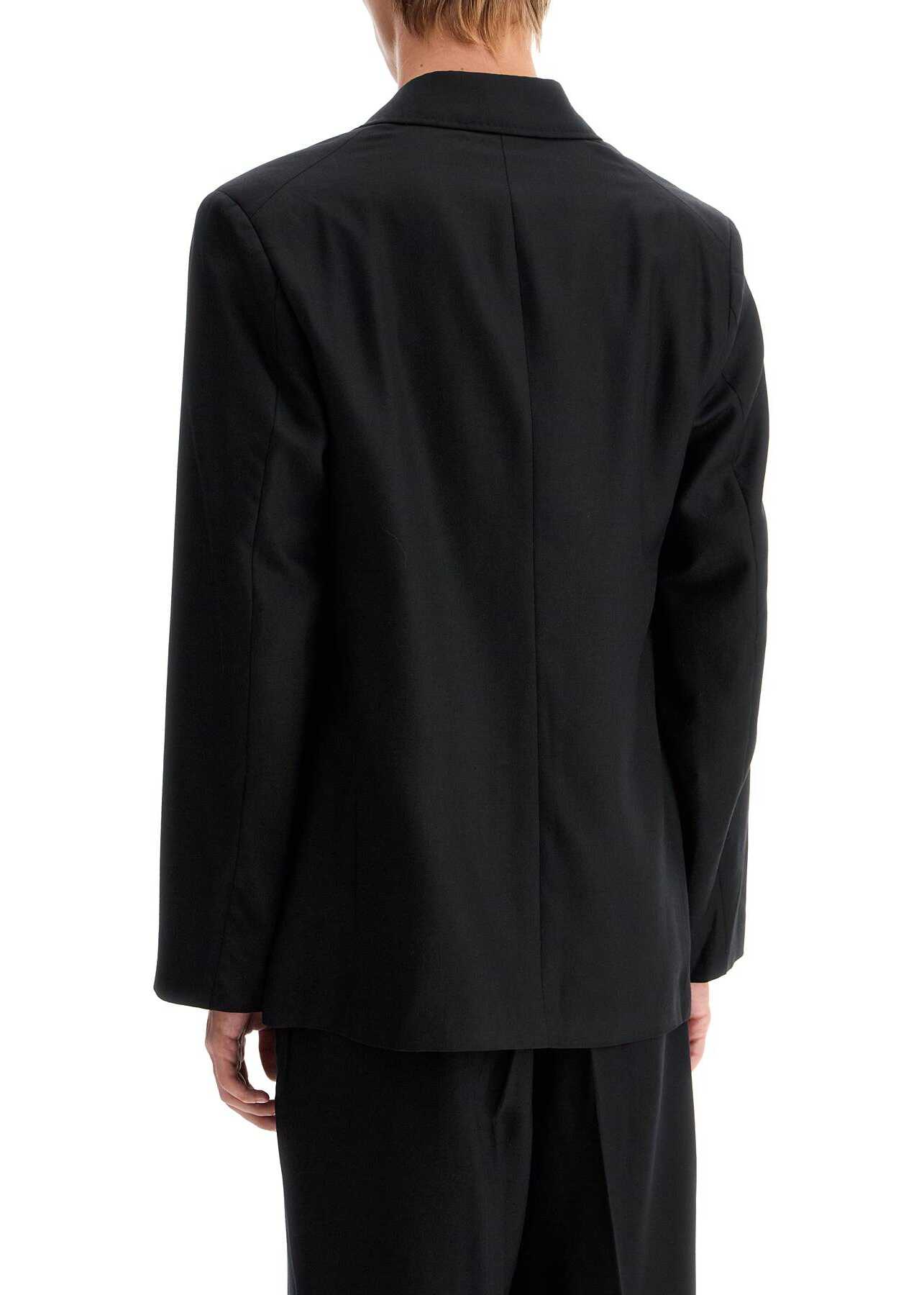 Our Legacy deconstructed blazer made of wool panama with a relaxed fit. Double-breasted six-button design with peak lapels, two flap pockets on the sides, one chest pocket and lined interior with two pockets. The model is 187 cm tall and wears size IT 48.