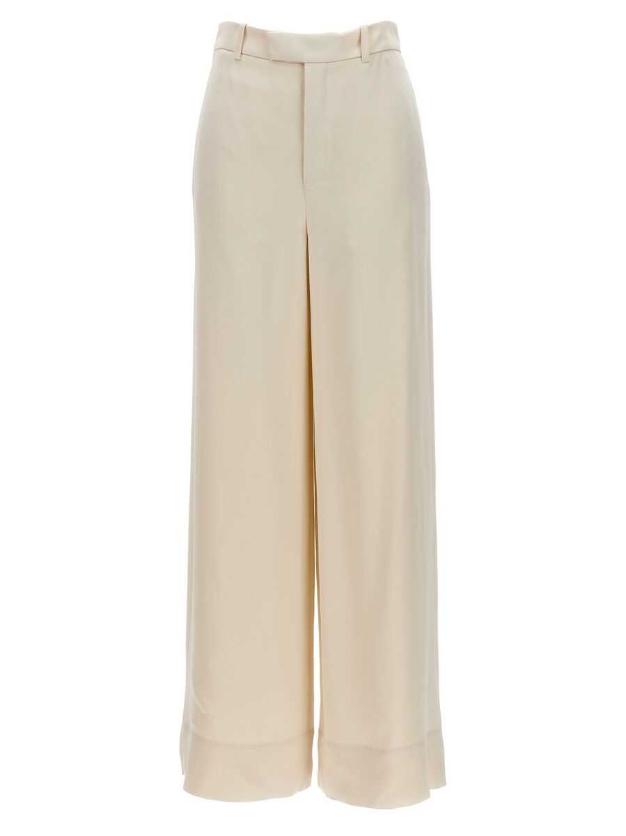 Saint Laurent's wide-leg pants crafted in ivory crepe envers satin. Featuring button closure, belt loops, multiple pockets and side slits. Unlined interior.