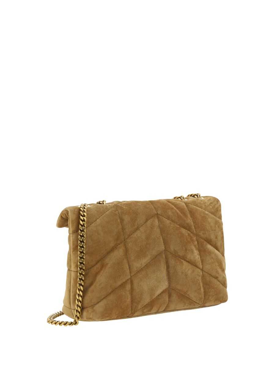 SAINT LAURENT LEATHER MINI CROSSBODY BAG, FRONT SNAP-BUTTON CLOSURE, SINGLE HANDLE, THREE-DIMENSIONAL ICONIC BRAND MONOGRAM PLAQUE APPLIQUE ON FRONT, CHAIN SHOULDER STRAP, PADDED AND QUILTED DESIGN, DUAL INTERIOR COMPARTMENTS, INTERIOR SLOT SLOTS, INTERIOR ZIPPERED WELT POCKET, MONOCHROME SUEDE DESIGN.