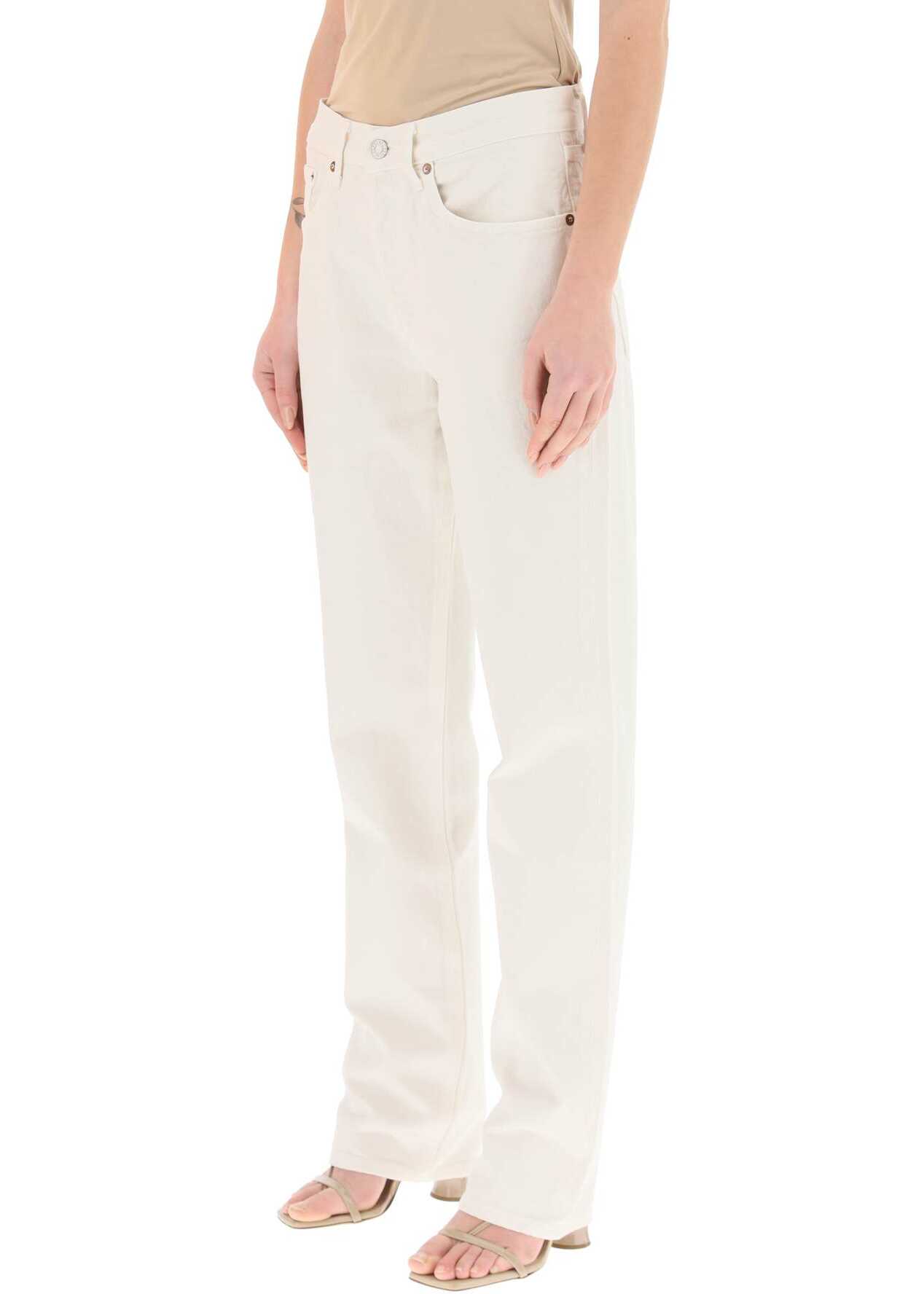 Agolde five-pocket jeans in pure organic cotton denim with light vintage wash, featuring a mid rise, straight leg regular cut. Button fly closure. The model is 177 cm tall and wears a size 26.