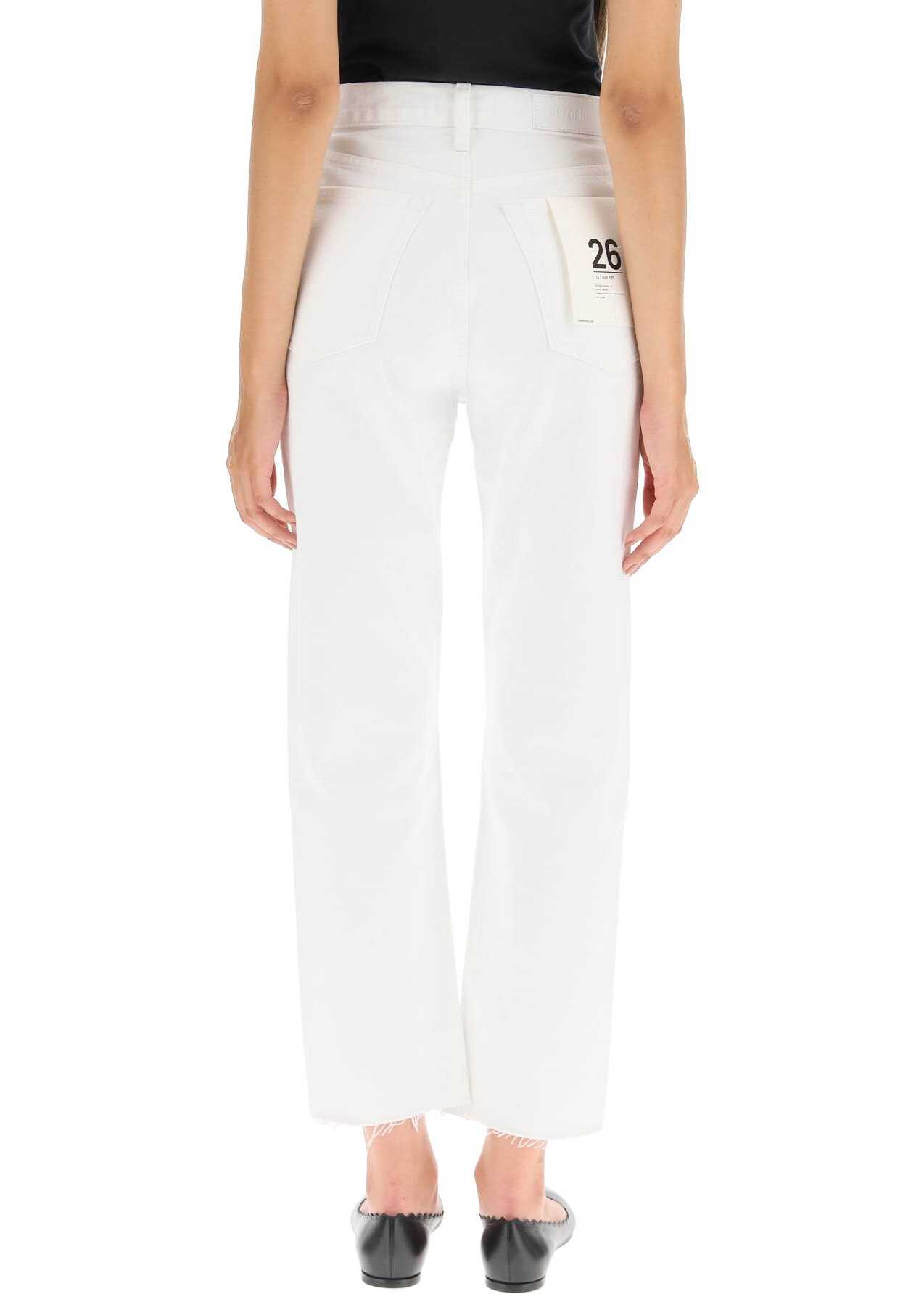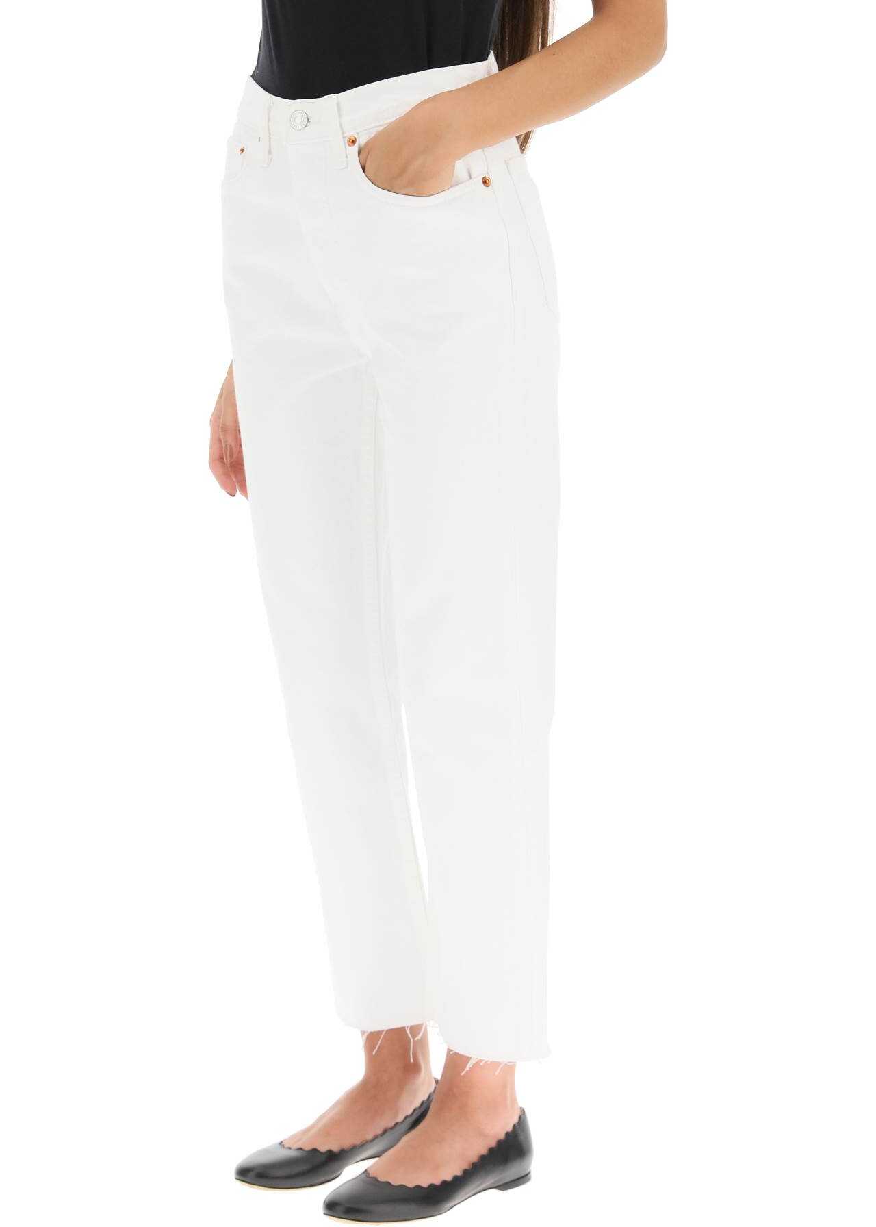 Re/Done five-pocket jeans in pure cotton denim. High-rise straight-leg fit with raw-cut cropped hem. Button fly, jacron on the back waist. The model is 177 cm tall and wears a size 26.