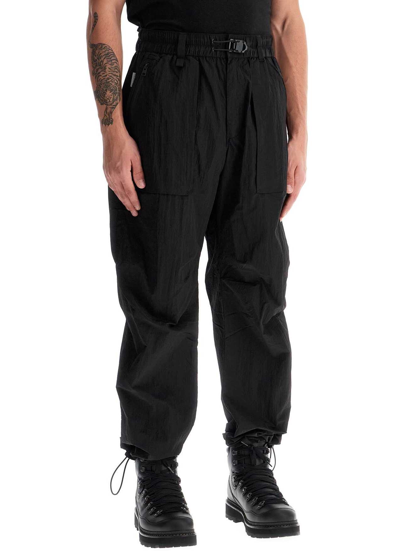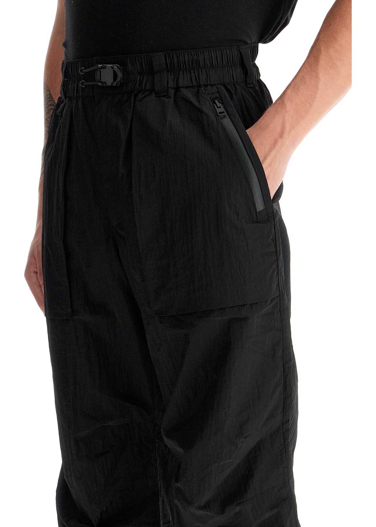Woolrich parachute pants made of shiny ripstop nylon with a wide adjustable cut at the bottom. Equipped with two side and two back pockets, they feature an elasticated waistband with loops, elastic drawstring, and zip and button closure. The model is 182 cm tall and wears size M.