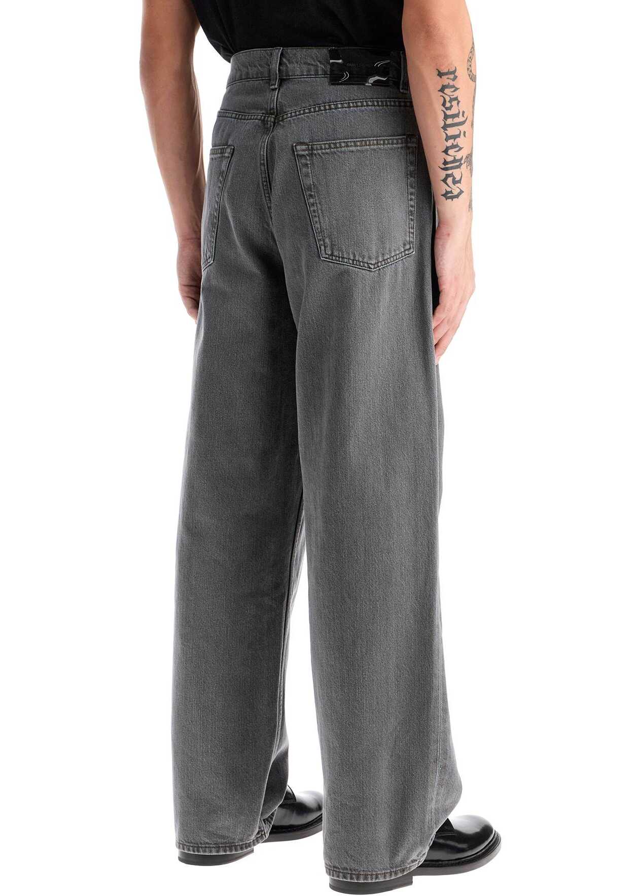 Our Legacy five-pocket jeans made of denim with Aluminium Tint wash. The cut is straight and wide, with belt loops and closure with zip and logo button. The model is 182 cm tall and wears size 31.