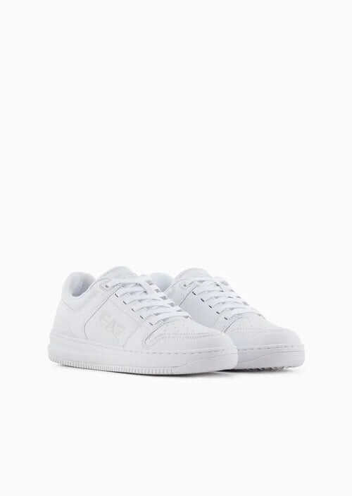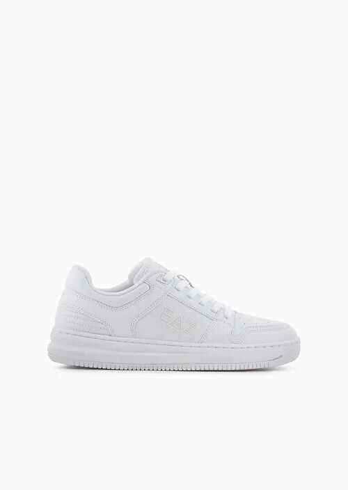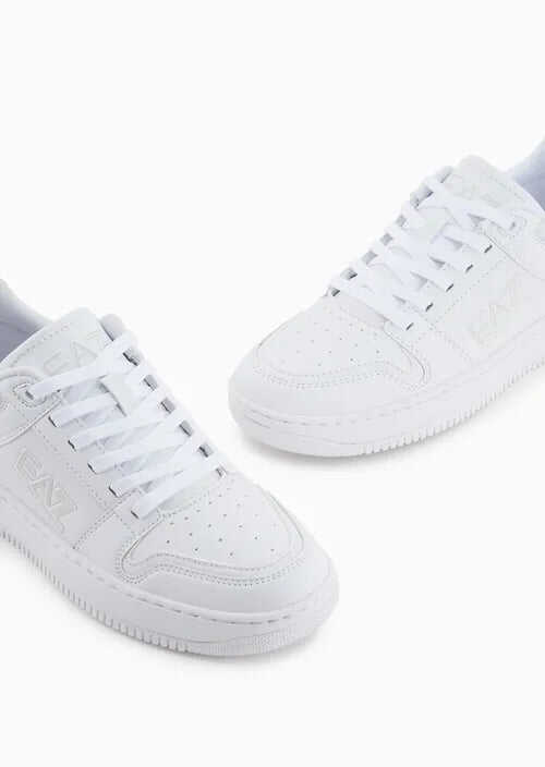 Step up your style game with these sleek white sneakers from EA7 Emporio Armani. Featuring a round toe and front closure with laces, these shoes are both fashionable and functional. The rubber sole provides durability and comfort, making them perfect for everyday wear. Elevate your look with these stylish shoes today!