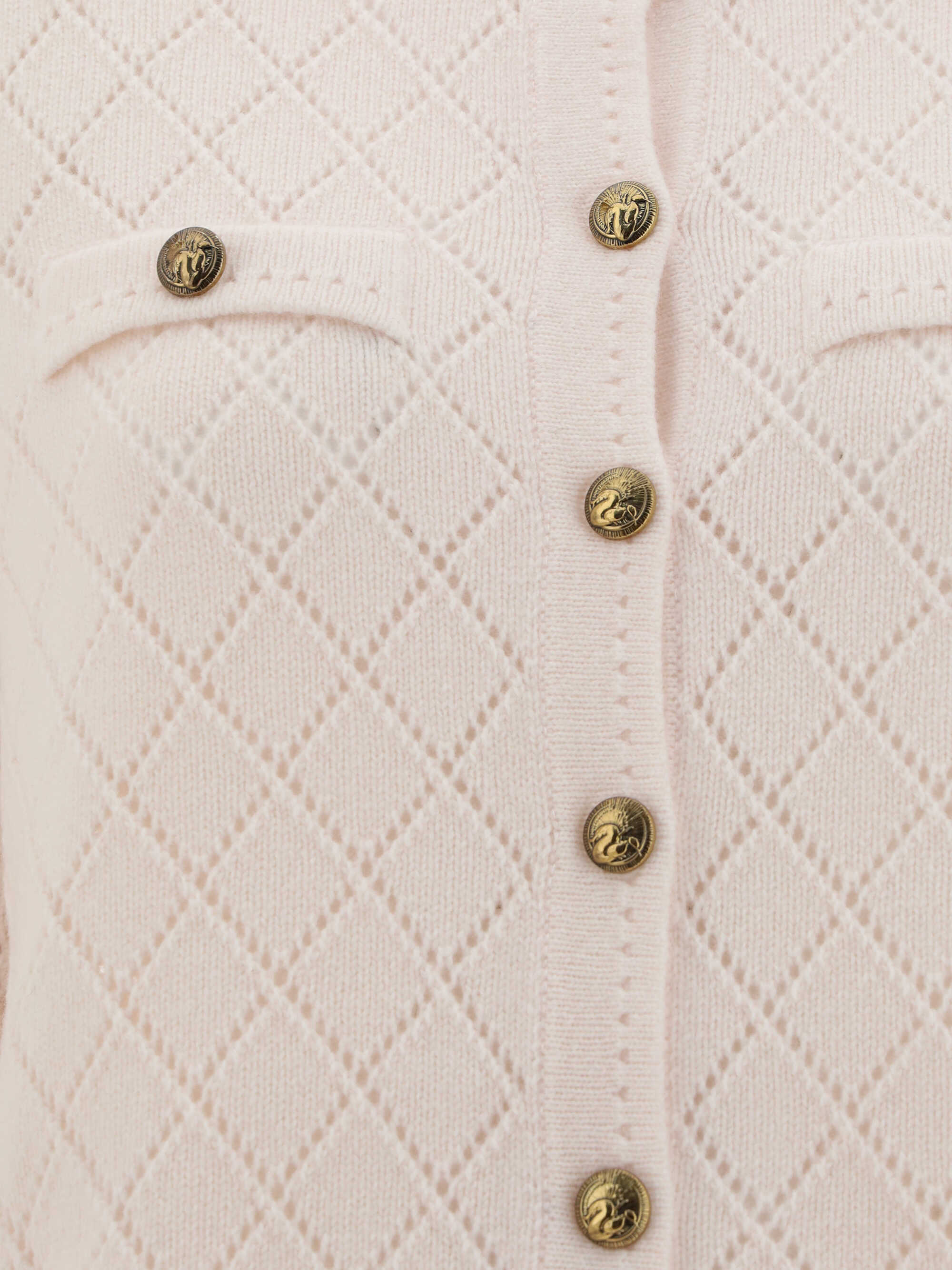Wool Cardigan by Zimmerman, perforated knit design, ribbed crew neck, two mock flap and button pockets on front, monochrome pattern, regular fit.