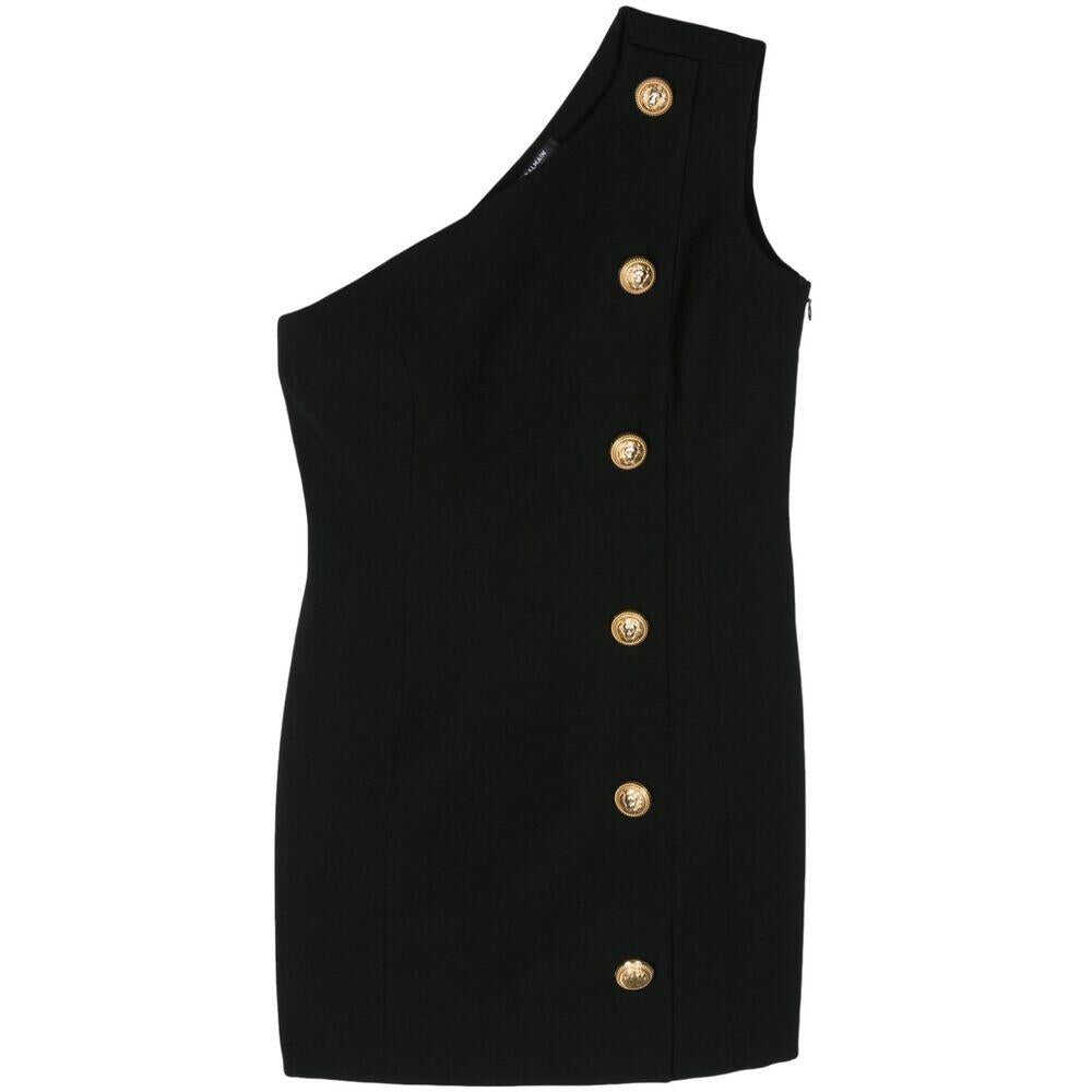 Black virgin wool one-shoulder sleeveless asymmetric neck decorative button detailing embossed gold-tone buttons thigh-length full lining straight hem concealed side hook and zip fastening