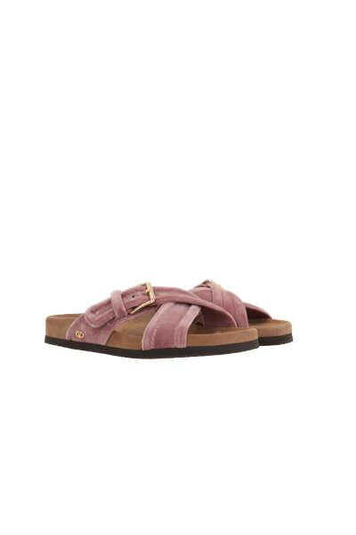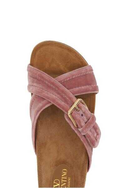 Valentino Garavani's slide sandals crafted in antique rose velvet. Featuring adjustable buckled strap, a round-toe silhouette, suede-lined anatomically shaped internal footbed and rubber sole. The design is completed by the iconic gold-tone metal VLogo Signature detail on side.