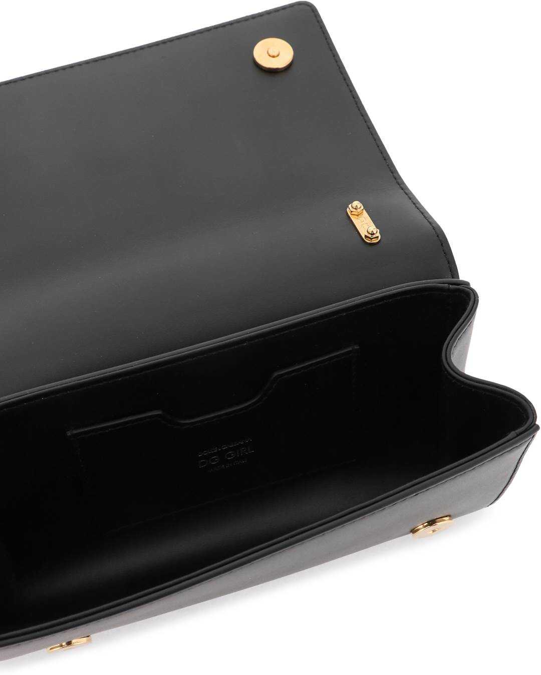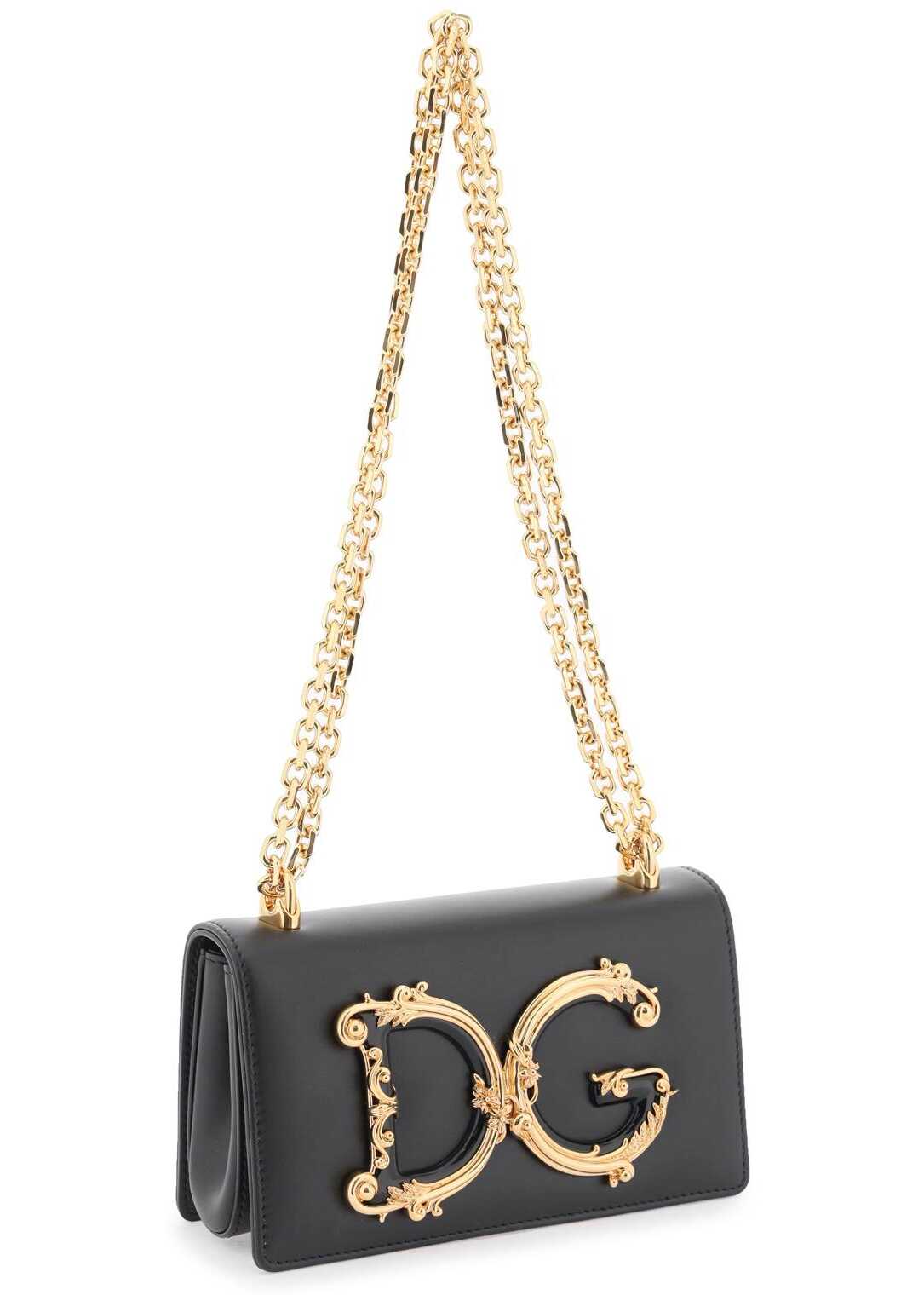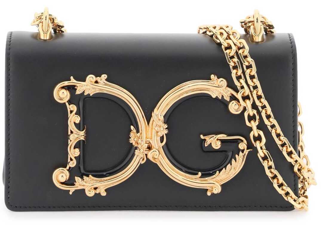 Mini bag by Dolce & Gabbana DG Girls line, made of smooth leather and characterized by frontal DG Barocco logo in enameled and amber gold-galvanized abs. It features double magnet closure, leather interior with one card slot, sliding chain shoulder strap.