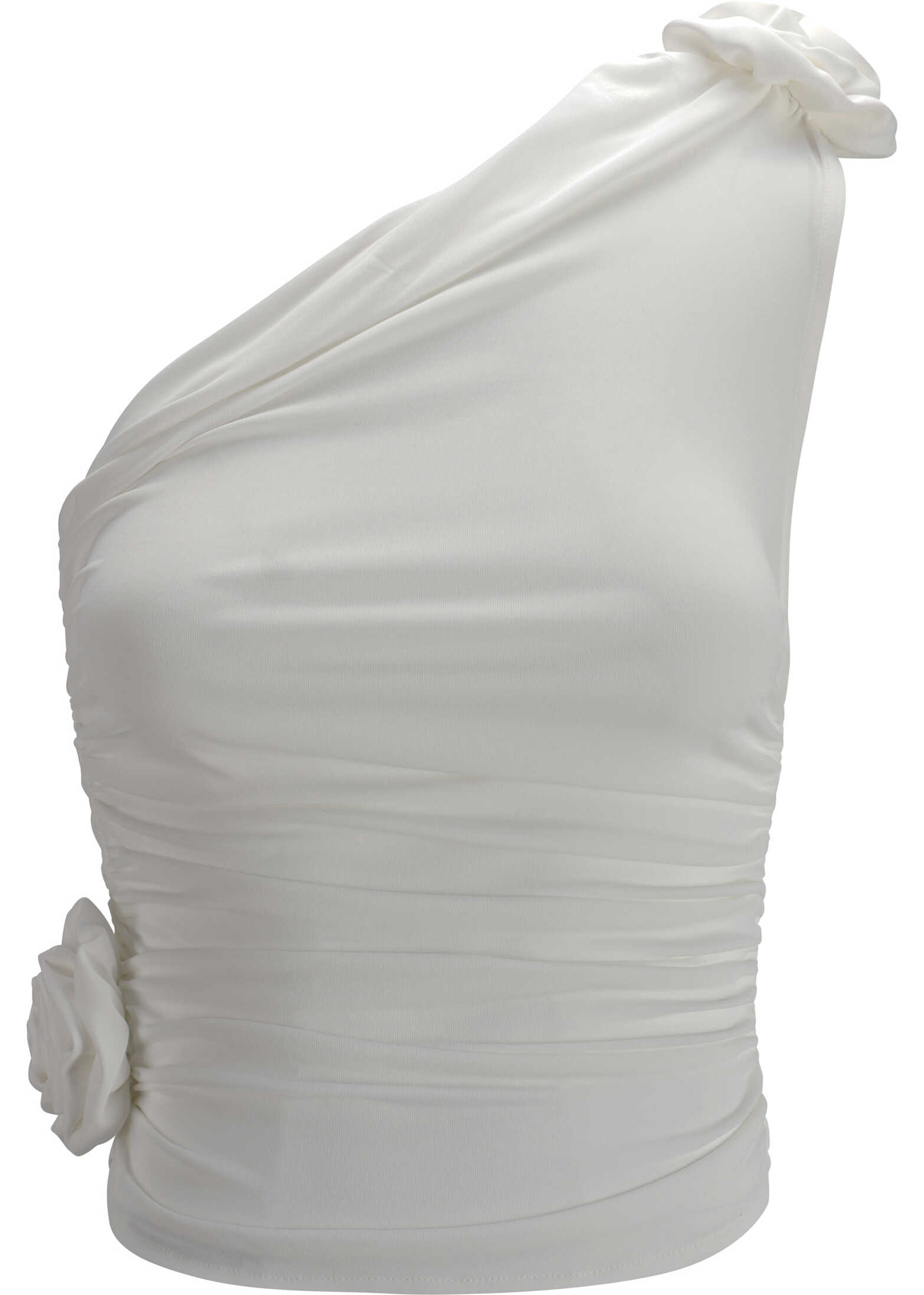 Top by Magda Butrym, one-shoulder design, ruched ruffle effect details on side panels, 3D pink applique detail on shoulder and side panel, monochrome pattern, slim fit.