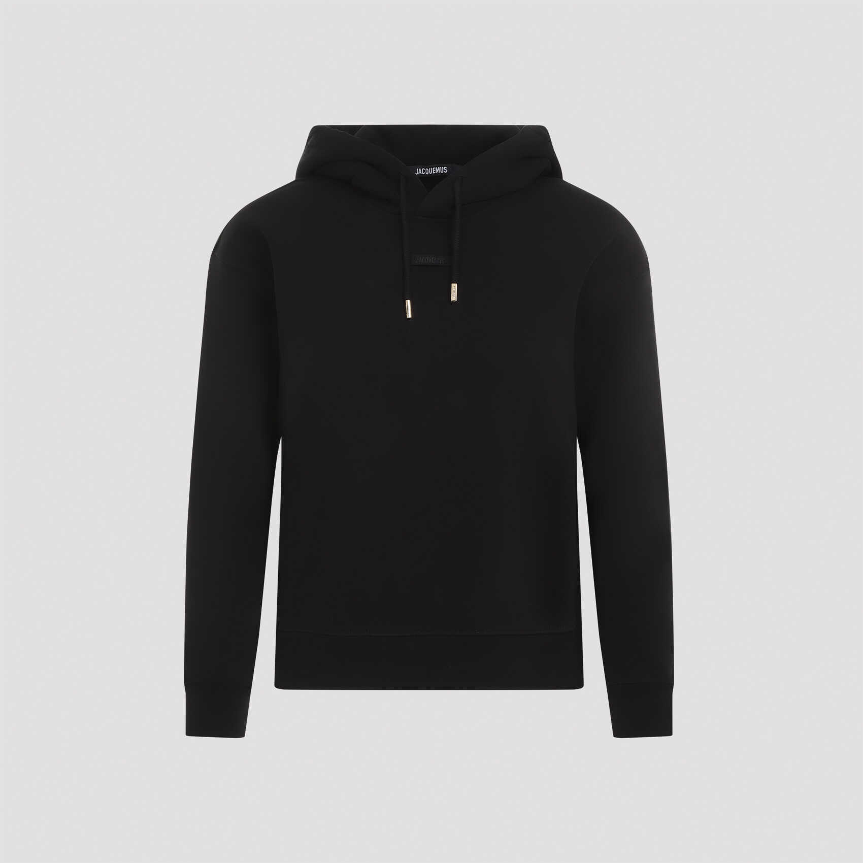 Elevate your style with this chic black cotton hoodie from JACQUEMUS. Featuring a trendy attached drawstring hood, ribbed cuffs and waistband for a comfortable fit, and a stylish logo label on the front. Made from 100% cotton, this hoodie is perfect for casual outings or lounging in style. Add a touch of sophistication to your wardrobe with this must-have piece. Get yours now!