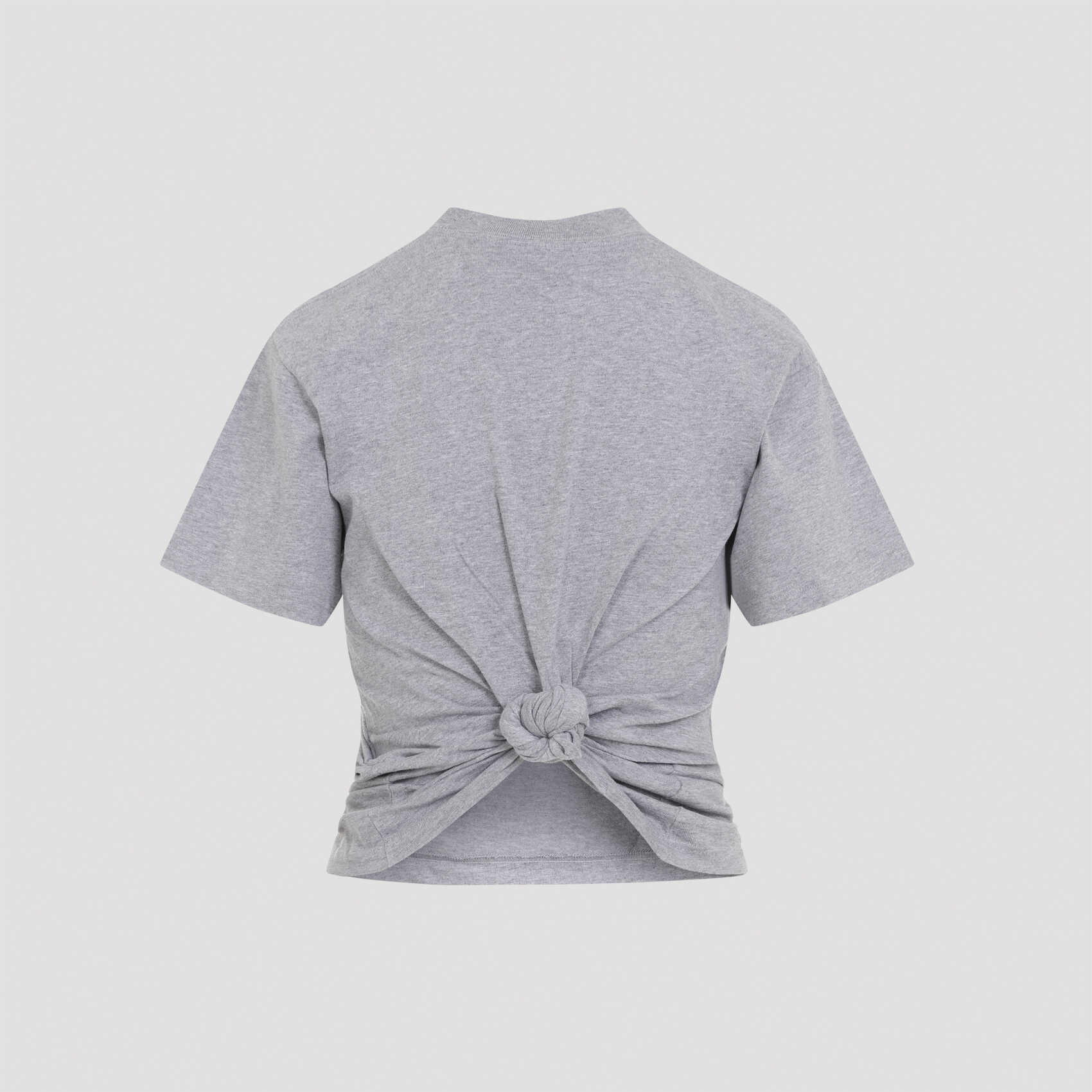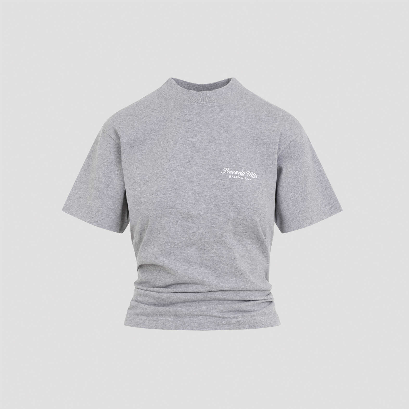 Elevate your casual style with this Balenciaga heather grey t-shirt. Made from 100% pure cotton, it features a round neck, contrasting white logo, back knotted detail, dropped shoulder, short sleeves, and an asymmetric hem. Perfect for a chic and edgy look. Get yours now!