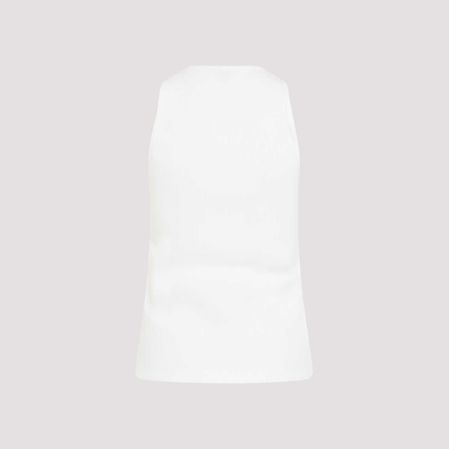 Elevate your wardrobe with this stunning Bottega Veneta white tank top. Crafted from a luxurious blend of cotton and elastane, this sleeveless top features a unique logo patch on the front. The stretch ribbed fabric ensures a comfortable fit, while the open round collar adds a touch of sophistication. Perfect for pairing with your favorite jeans or skirts, this top is a versatile addition to any outfit. Embrace effortless style with Bottega Veneta.