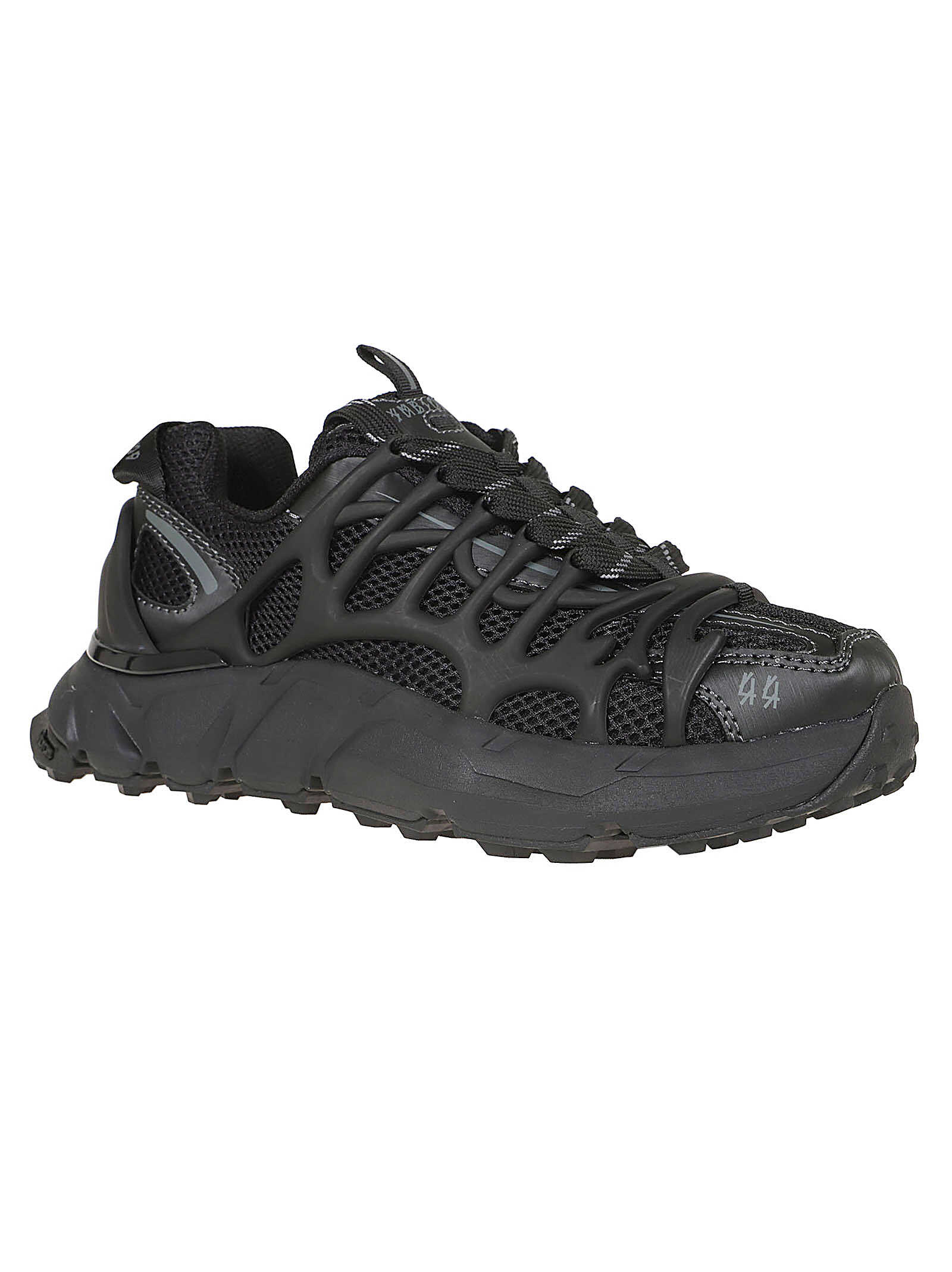 Experience ultimate comfort and style with the Symbiont T2.0 sneakers from 44 Label Group. Featuring a sleek black design and a Vibram sole for superior support. The custom-made cage detail adds a unique touch. Made with high-quality polyester and rubber materials. Elevate your sneaker game with these top-of-the-line kicks.
