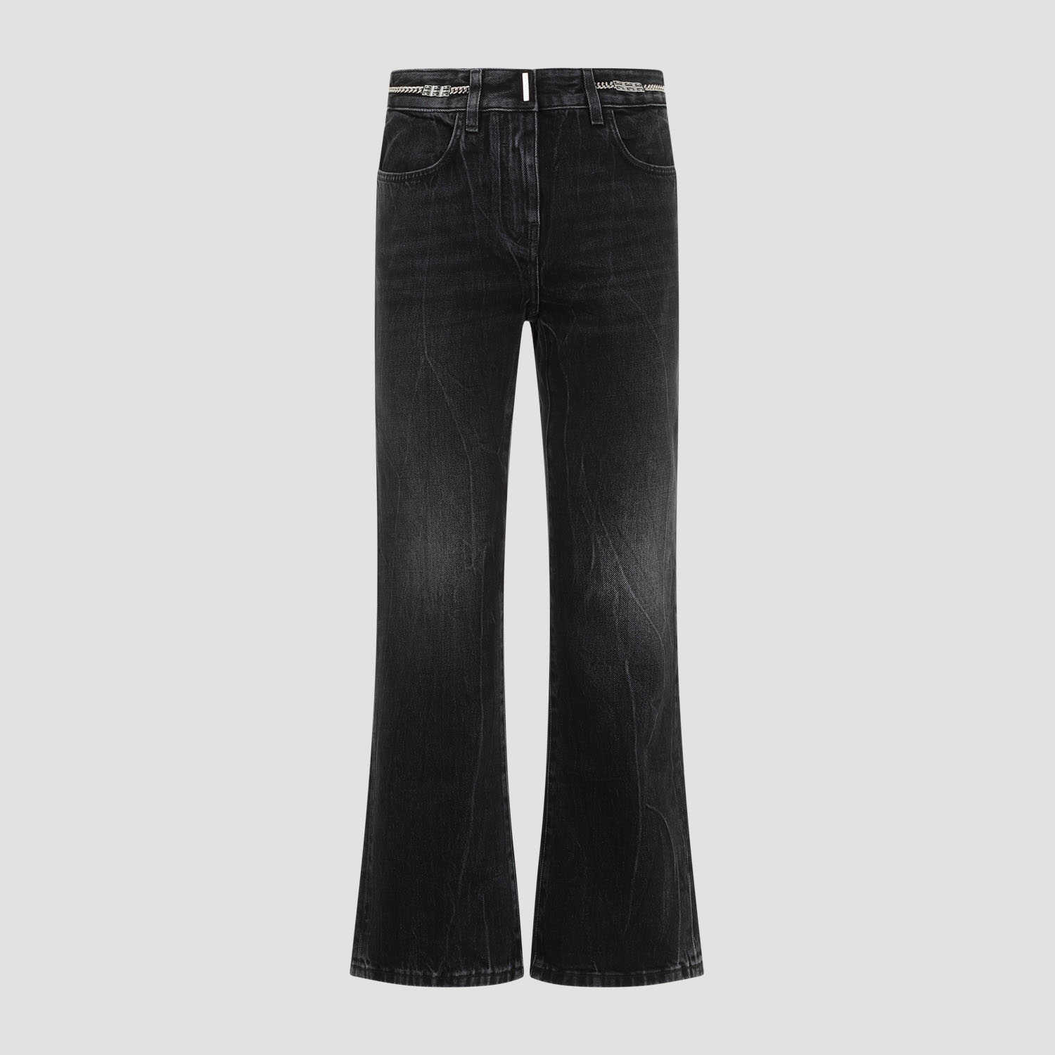 Step out in style with these chic Givenchy black cotton denim pants. Featuring a vintage effect, front zipper with metal bar closure, detachable branded metal chain, and multiple pockets for convenience. The boot cut fit and cropped length add a trendy touch to your look. Elevate your wardrobe with these fashionable pants from the iconic brand Givenchy.