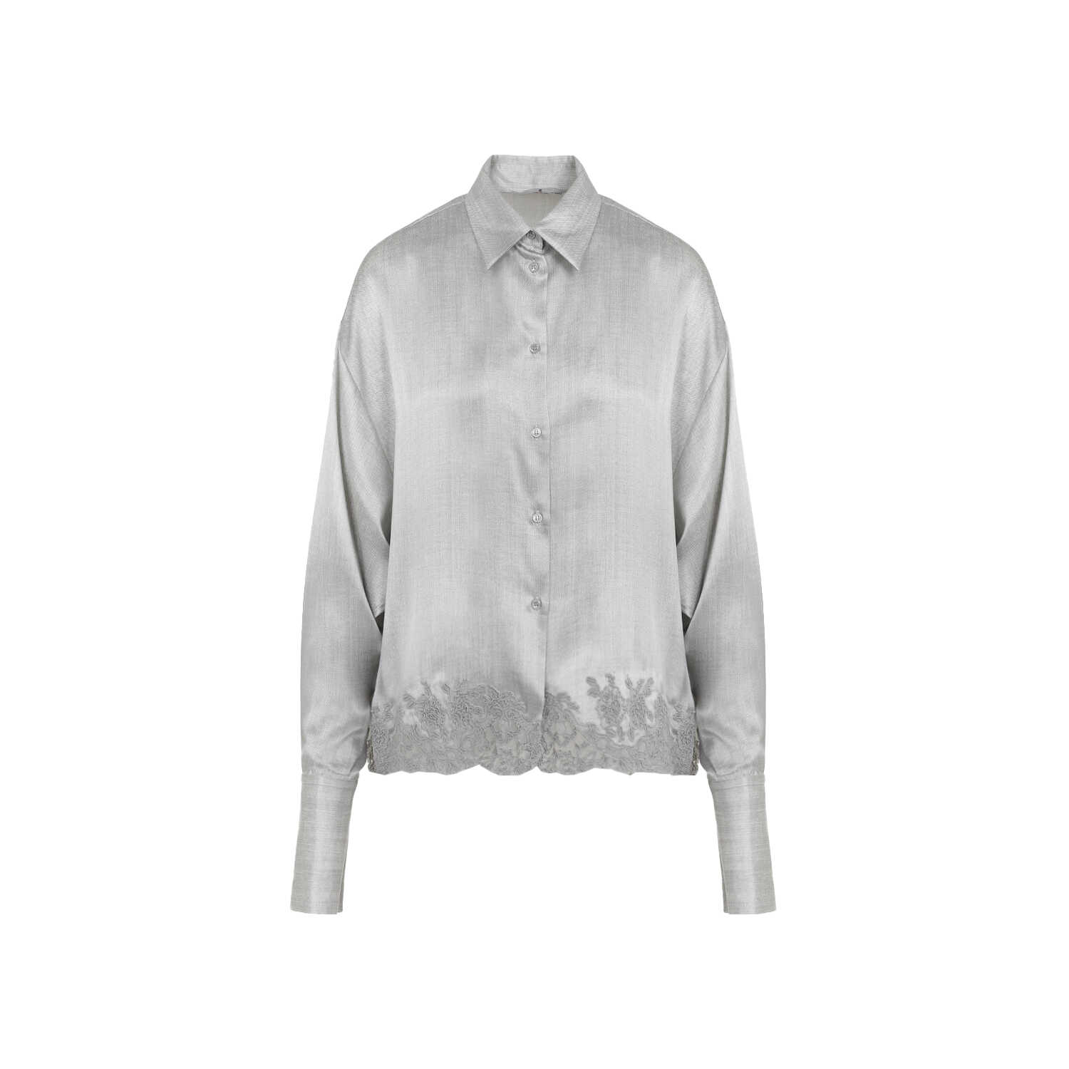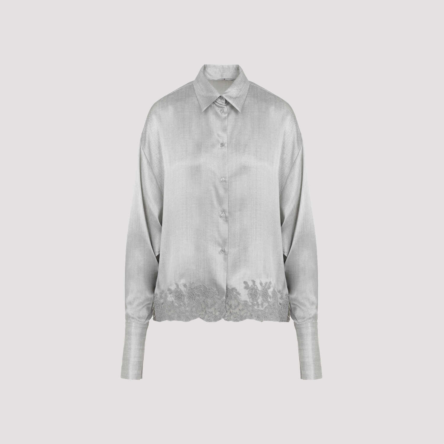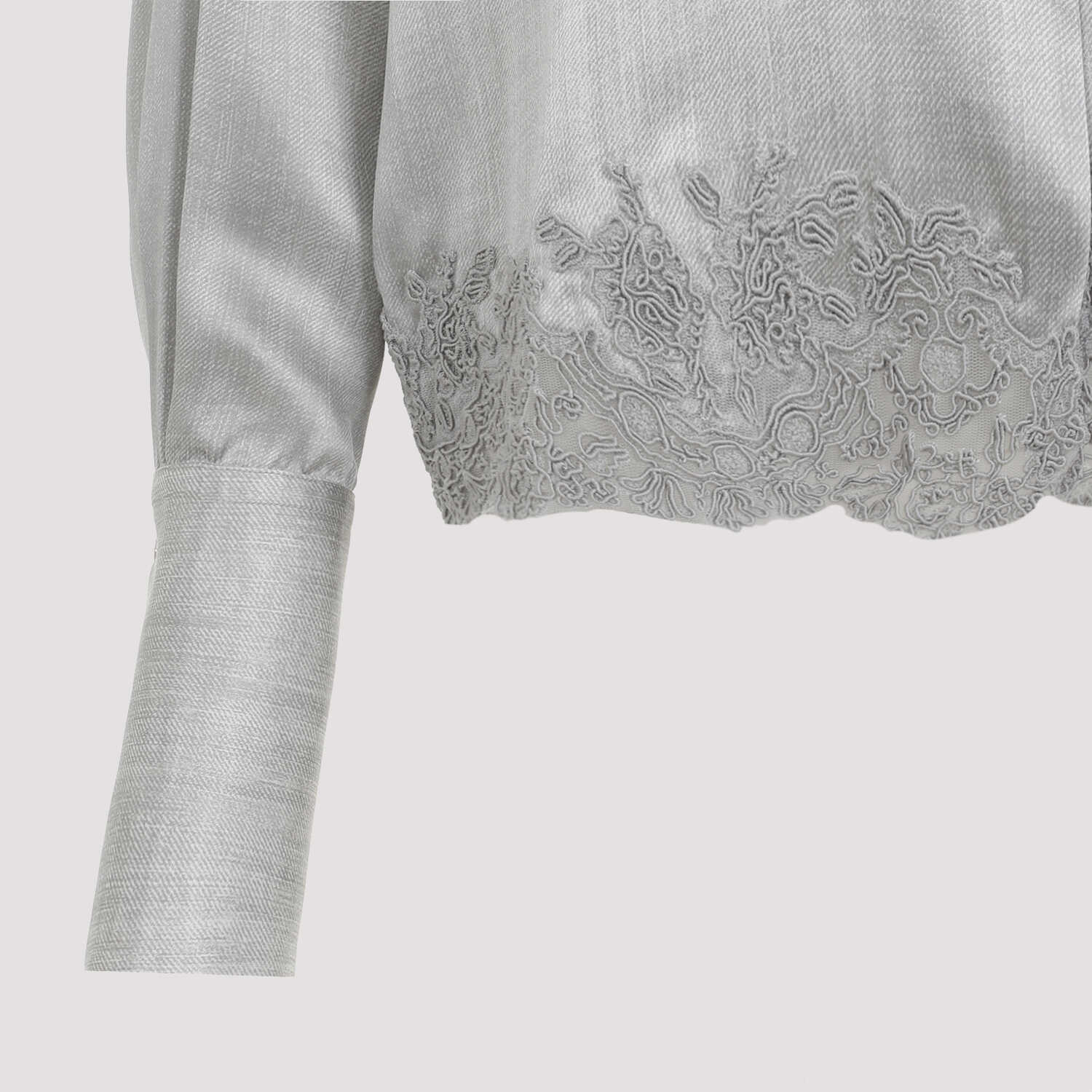 Elevate your style with this luxurious Ermanno Scervino silk shirt in elegant grey. Featuring a pointed collar, button closure, and delicate lace insert, this piece exudes sophistication. Perfect for any occasion, this shirt is a must-have for the modern woman. Embrace the timeless elegance of ERMANNO SCERVINO.