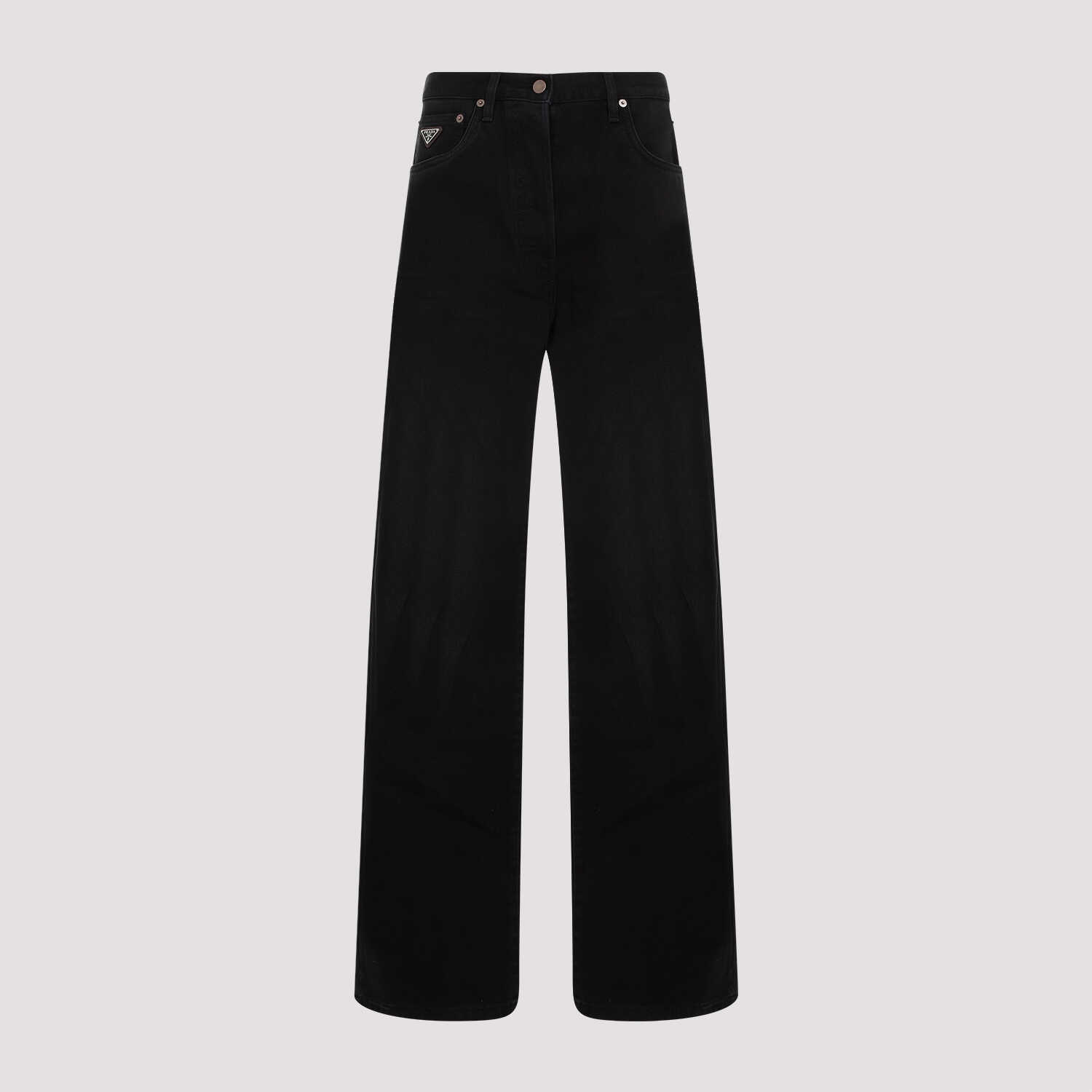 Elevate your style with these chic PRADA black cotton jeans. Crafted from high-quality cotton denim, featuring belt loops, front button and fly-zip closure, 5-pocket design, and enameled triangle logo. Complete with branded label and sliding tabs at the back waist, these wide leg trousers are a must-have for every fashion-forward woman. Embrace luxury with PRADA.