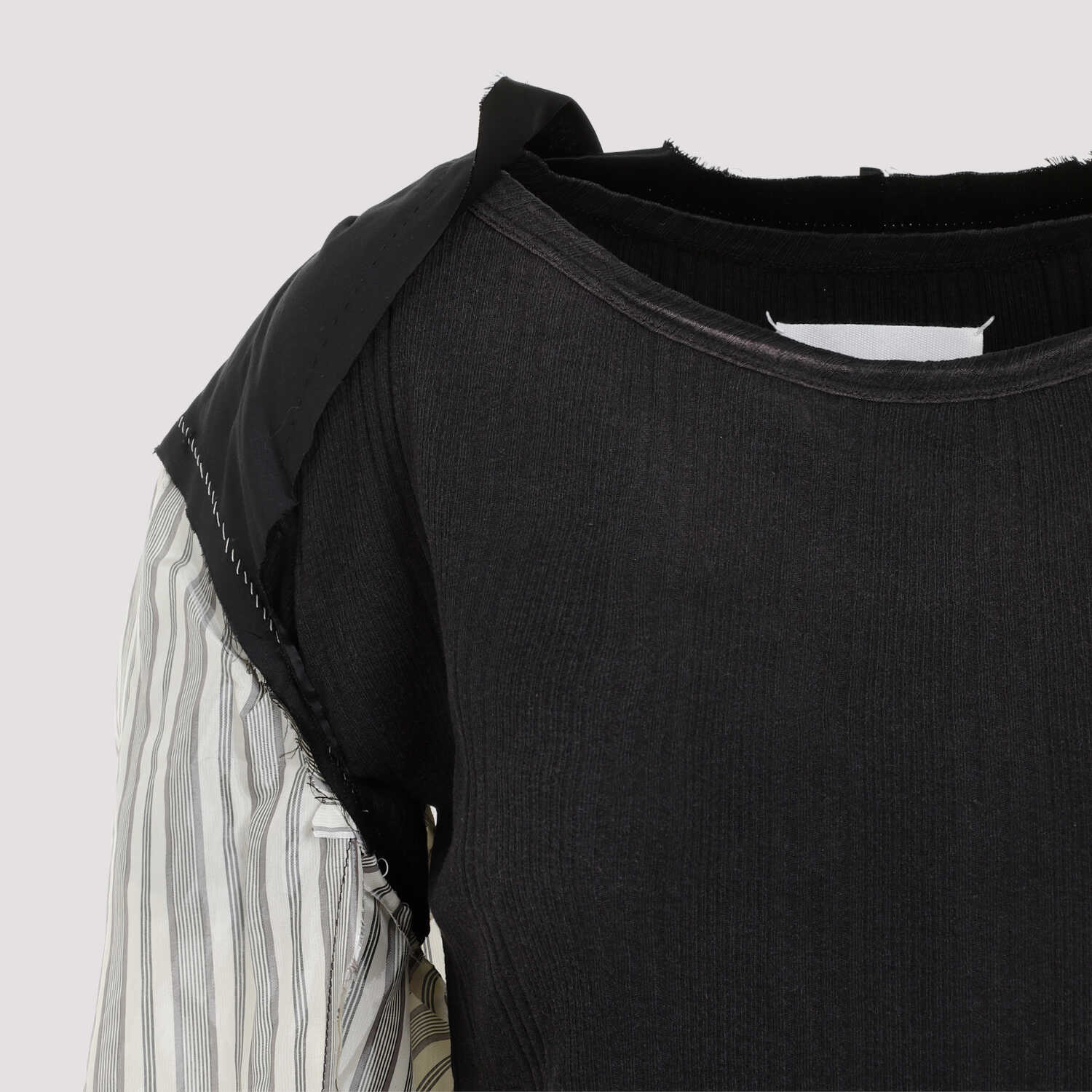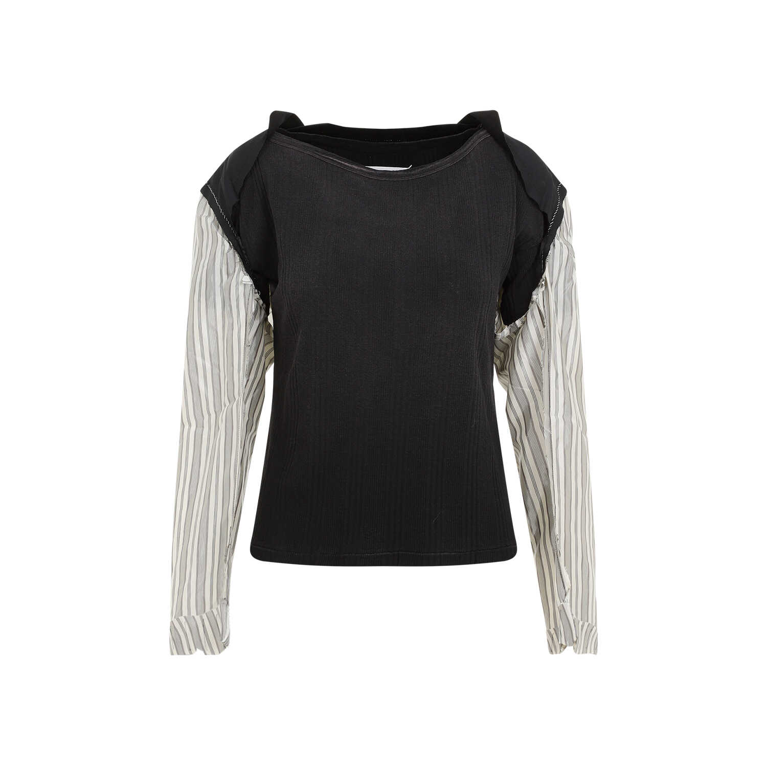 Elevate your style with this Maison Margiela black cotton t-shirt. Made from premium cotton, featuring an open round collar, raw cut inserts, and white contrasting stitching details. The unfinished-effect shirt sleeves add a unique touch, while the straight hem ensures a comfortable fit. Perfect for adding a chic edge to your casual wardrobe.