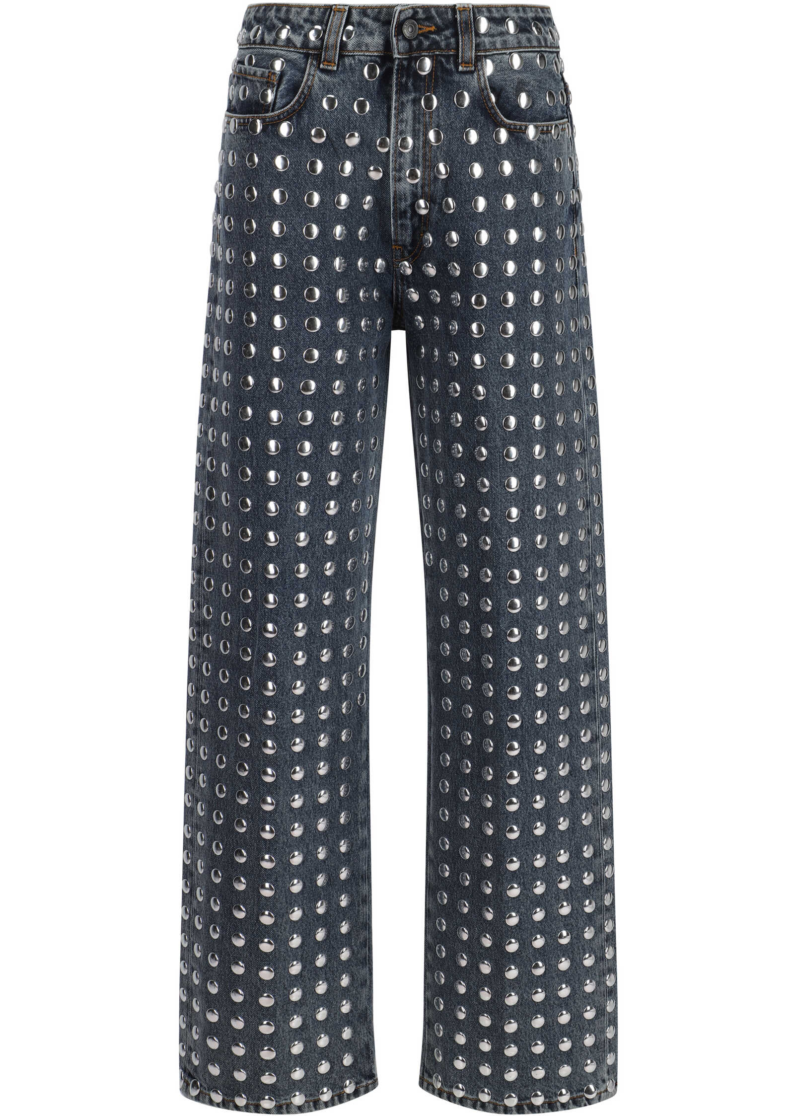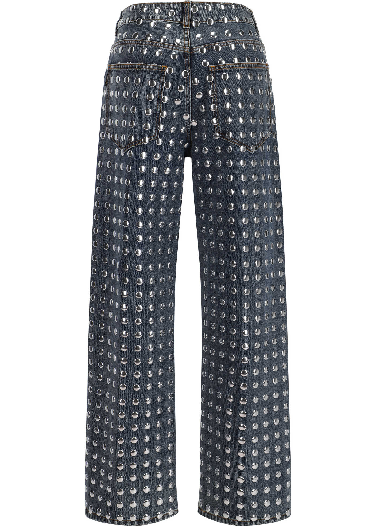 Cotton Jeans by Haikure, five-pocket design, front button and zipper closure, waistband loops, all-over round applied studs, monochrome pattern, regular fit.