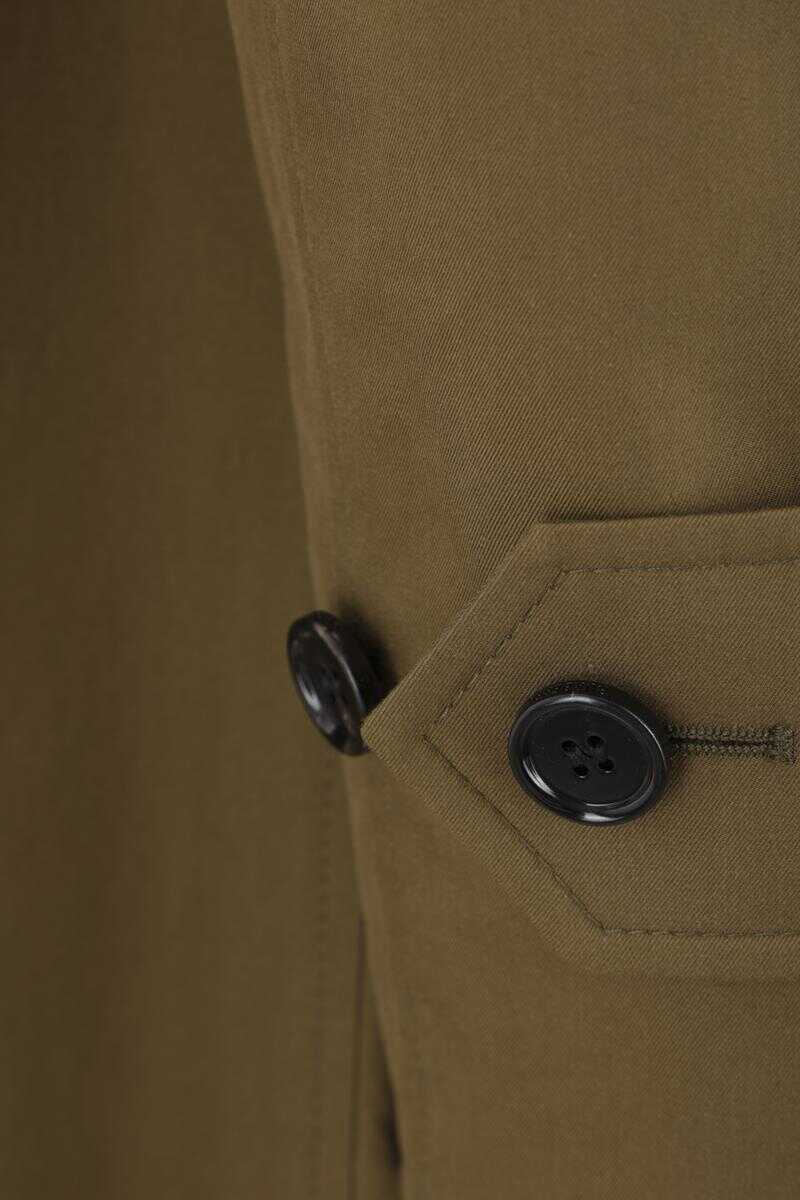 Burberry's reversible trench coat crafted in khaki green cotton gabardine on one side and Check print on the other. It features a pointed collar, button fastening, side welt pockets, long sleeves with button-tab at cuffs and back central vent.