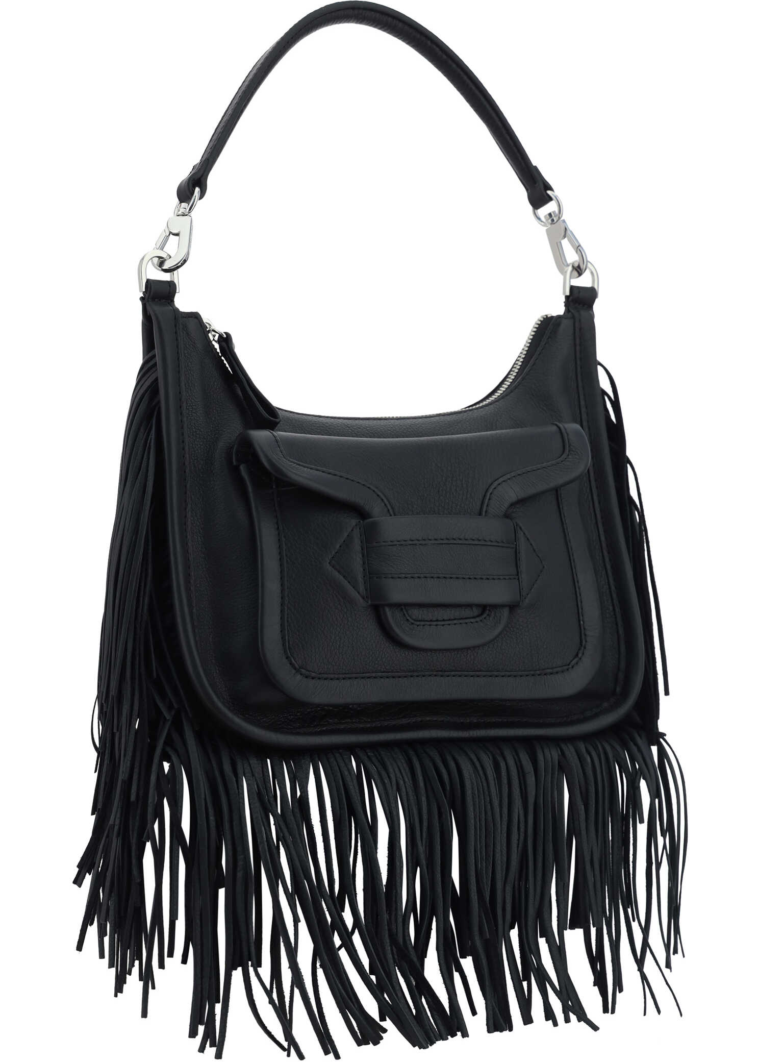 The Alpha Day Miss Texas Shoulder Bag by Pierre Hardy is a stylish and functional accessory made of high-quality leather. It features a removable flat handle and an adjustable, removable shoulder strap for different modes of use. The top zipper closure provides security, while the front patch pocket with flap and snap closure adds practicality. The design is completed with a fringe detail at the bottom, giving it a unique touch of movement and style.