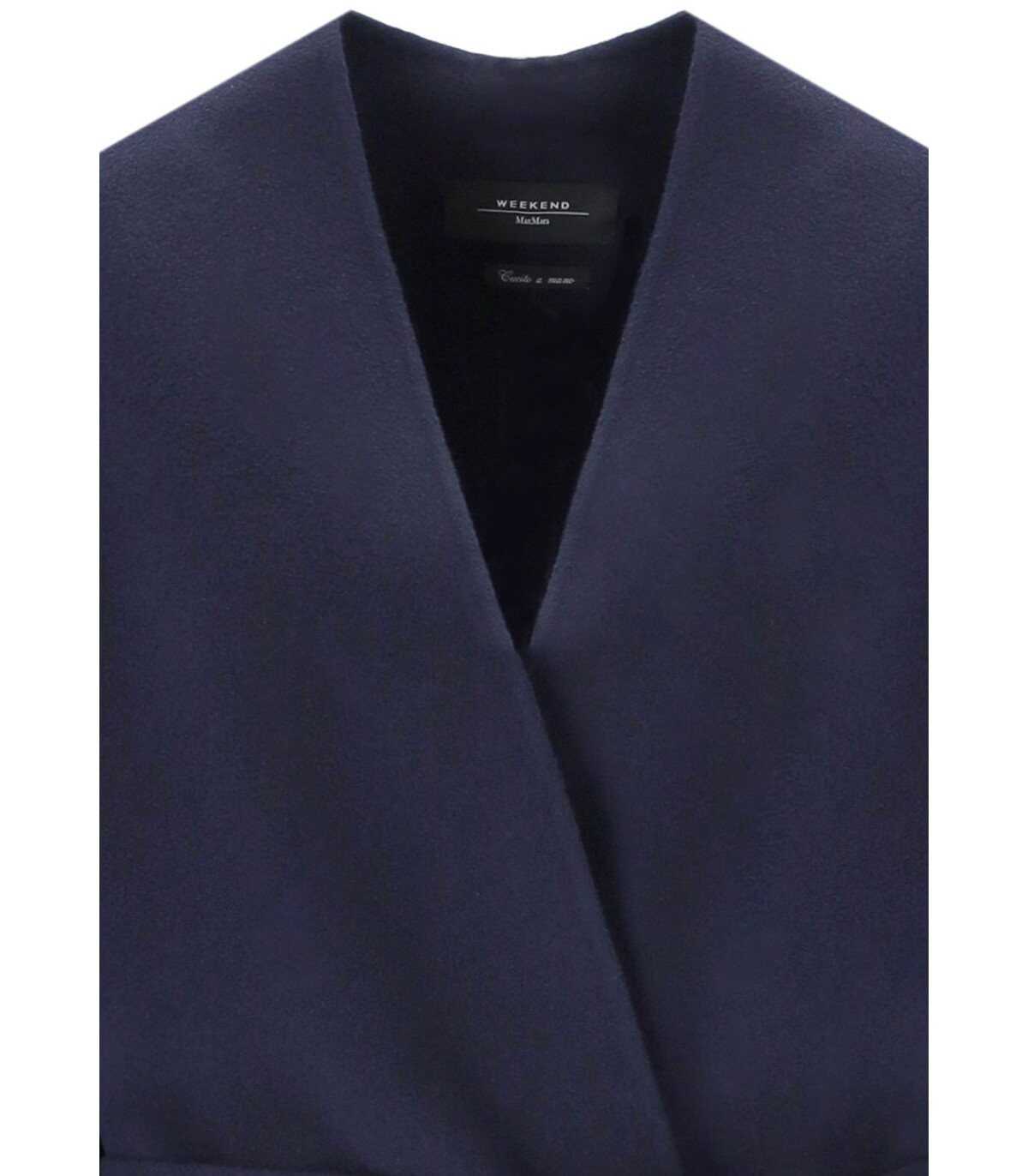 Long coat by Max Mara Weekend made of dark blue wool. Characterized by a flared robe shape, it features a lapel collar, long kimono sleeves, and welt pockets. The closure has a wraparound belt. The back is finished with a central vent.
