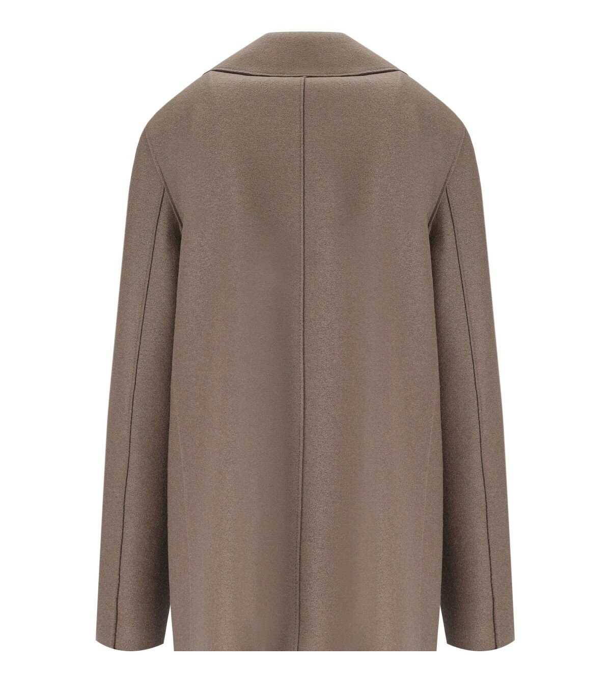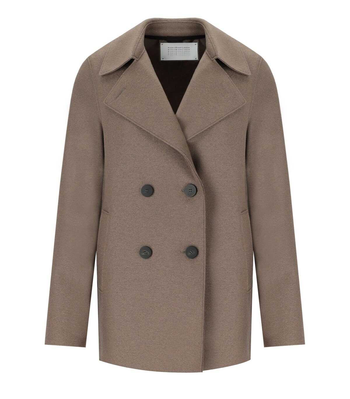 Double-breasted jacket by Harris Wharf London made of pure virgin wool in a taupe color. The model features a tailored line with raw finishes, long sleeves, and welt pockets. The collar is recognizable for its classic wide lapel shape. The front of the jacket is fastened with four black buttons.