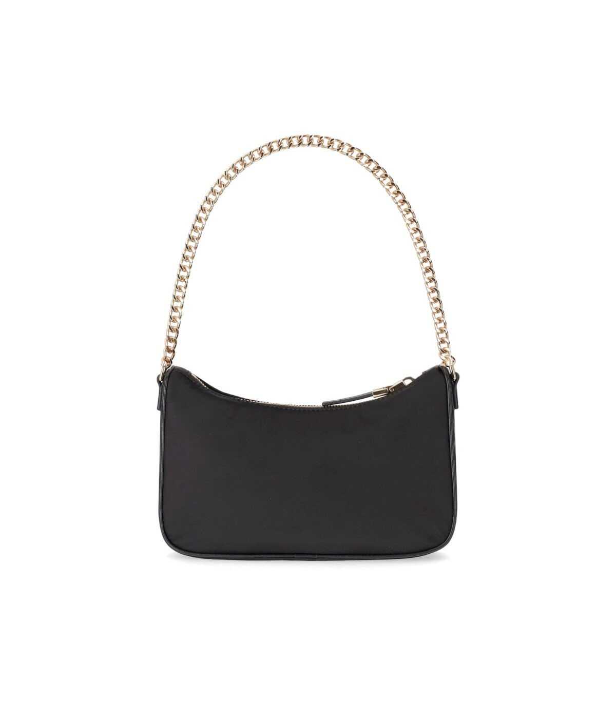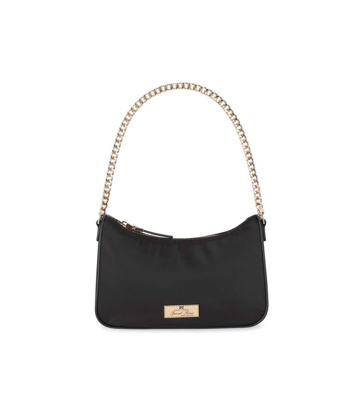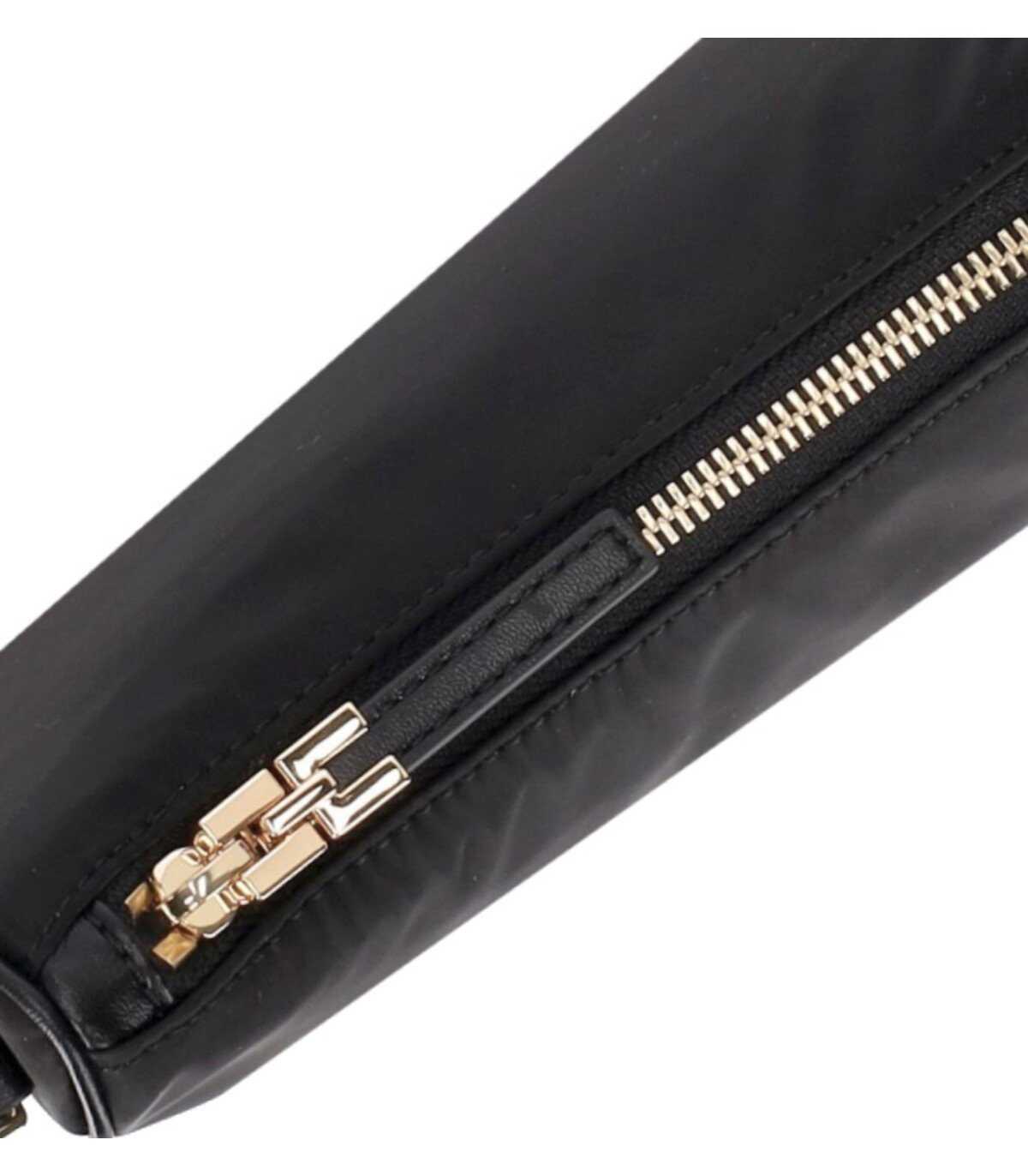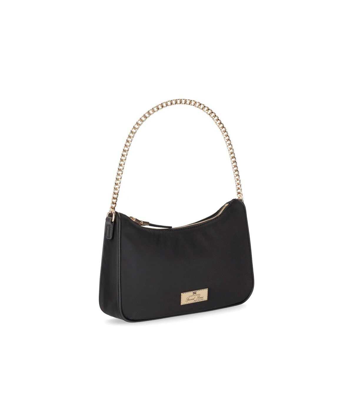 Elisabetta Franchi bag made of technical fabric (nylon) in black. Characterized by an internal zip pocket, it features a gold metal zip closure and a double jacquard ribbon shoulder strap. Finished with a small gold logo plate, dimensions 23x15x4 cm.