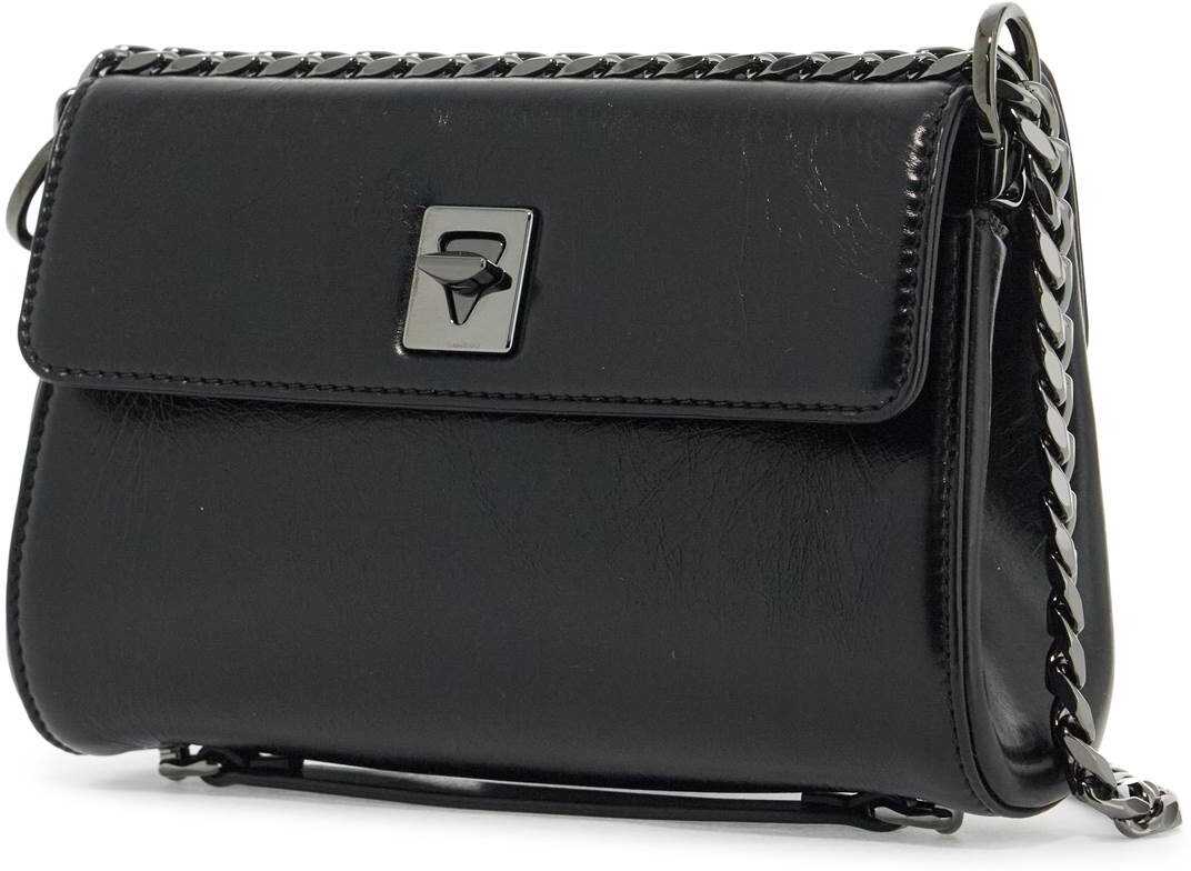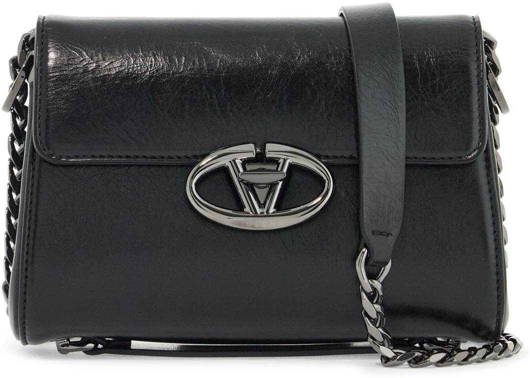 The small shoulder bag by Valentino Garavani is made of craquelé leather and features the VLogo Locker closure and expandable sides. The interior is lined with nappa leather and has an open pocket and a zippered pocket, as well as an additional back pocket with flap and twist lock closure. Its versatile design includes a sliding chain strap for wearing it on the shoulder or crossbody, and a handle at the bottom for a handheld look. Metallic accessories have a ruthenium finish