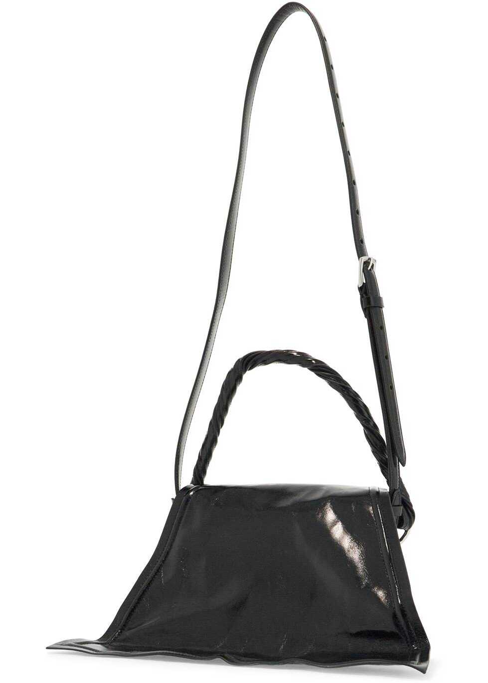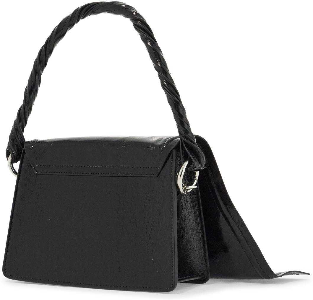 The Y/PROJECT handbag is made of smooth leather and features flexible wires integrated into the edges of the flap, allowing for different shapes to be created. It has a removable handle in woven leather, a suede interior with an open pocket, and an adjustable and removable shoulder strap. Finished with silver metal logo lettering under the flap. Metal accessories with a silver finish complete the design.