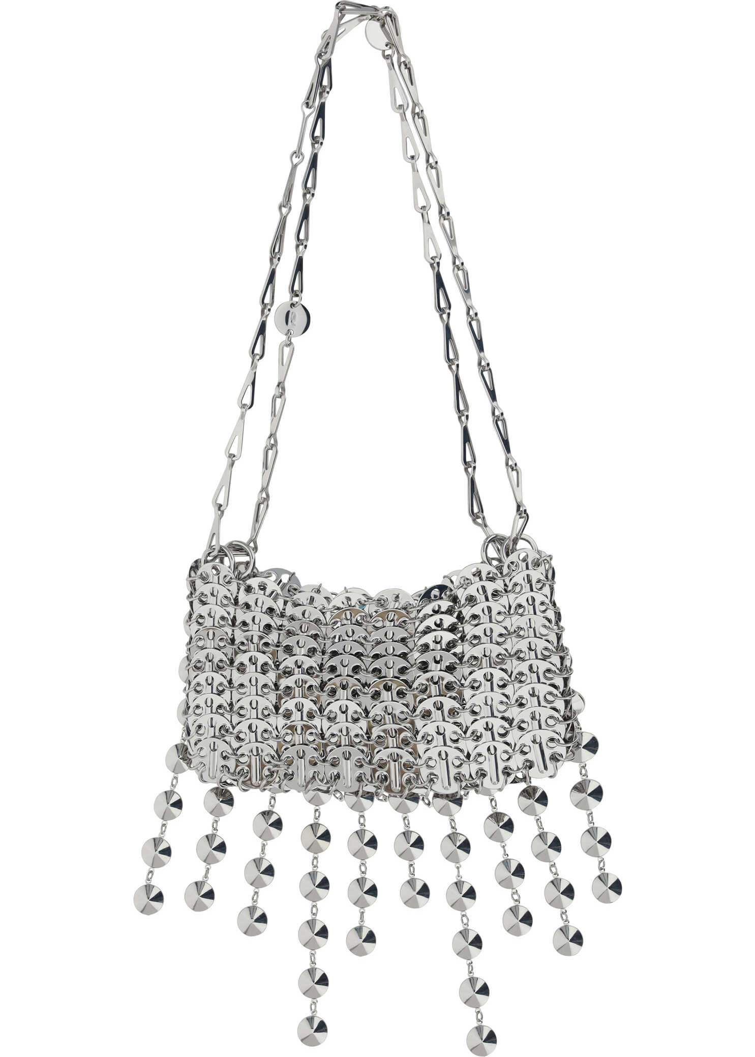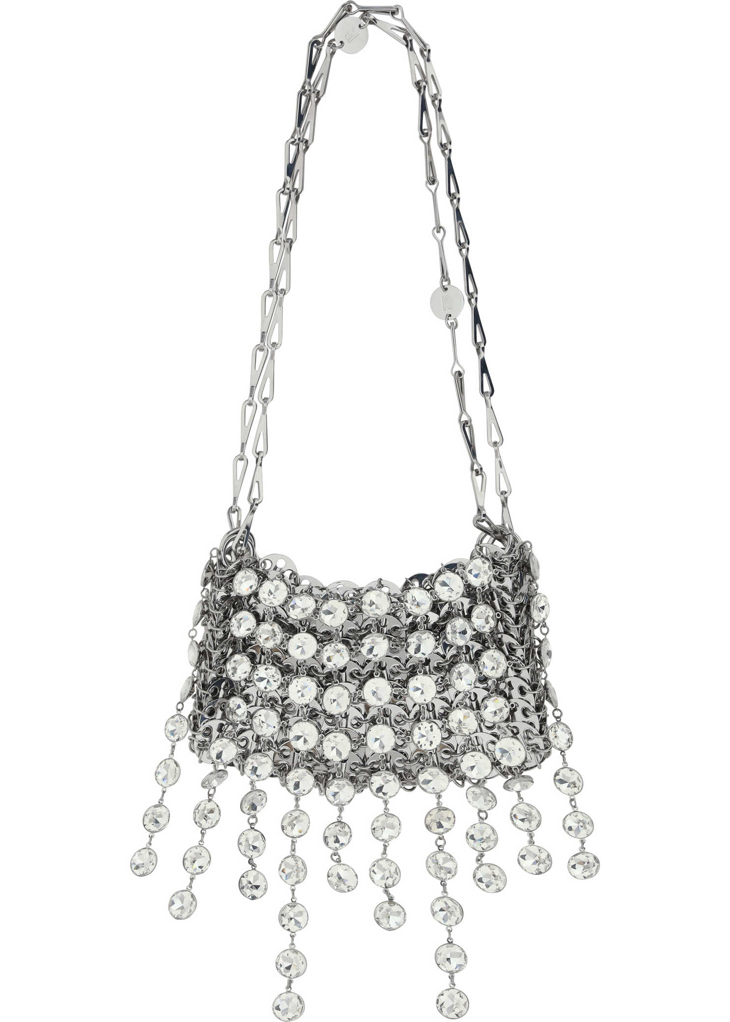 Nano 1969 Shoulder Bag by Rabanne, double top chain handle, concealed magnetic closure, all-over appliqued shiny jewels with hanging details on the bottom of the bag, single interior compartment